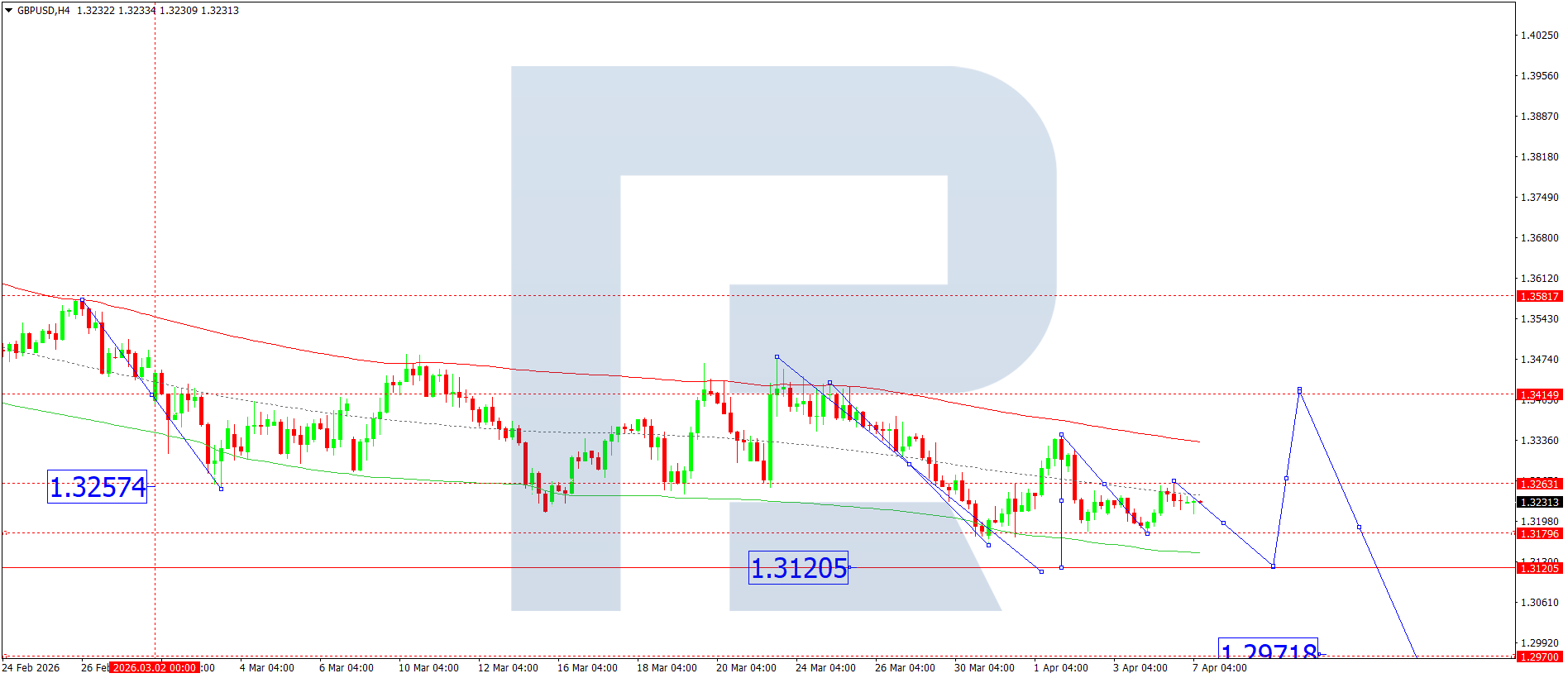 GBPUSD жұбының H4 графигінде нарық 1.3265 деңгейіне дейін өсу толқынын қалыптастырып, кейін 1.3210 деңгейіне дейін төмендеді. Бүгін, 2026 жылғы 7 сәуірде, осы деңгейден төмен консолидация диапазоны қалыптасады деп күтілуде. Төменге бұзылу 1.3120 деңгейіне дейін төмендеуге әкеледі, ал жоғарыға бұзылу 1.3260 деңгейіне дейін өсуге мүмкіндік береді.