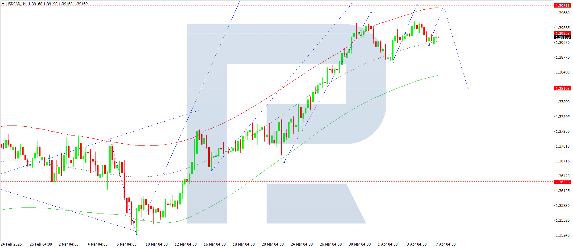 USDCAD жұбының H4 графигінде нарық 1.3929 деңгейіне дейін өсу толқынын аяқтады. Бүгін, 2026 жылғы 7 сәуірде, осы деңгейден жоғары консолидация диапазоны қалыптасуы мүмкін. Төменге бұзылу 1.3890 деңгейіне дейін төмендеуге әкеледі, ал жоғарыға бұзылу 1.3981 деңгейіне дейін өсуді жалғастырады.
