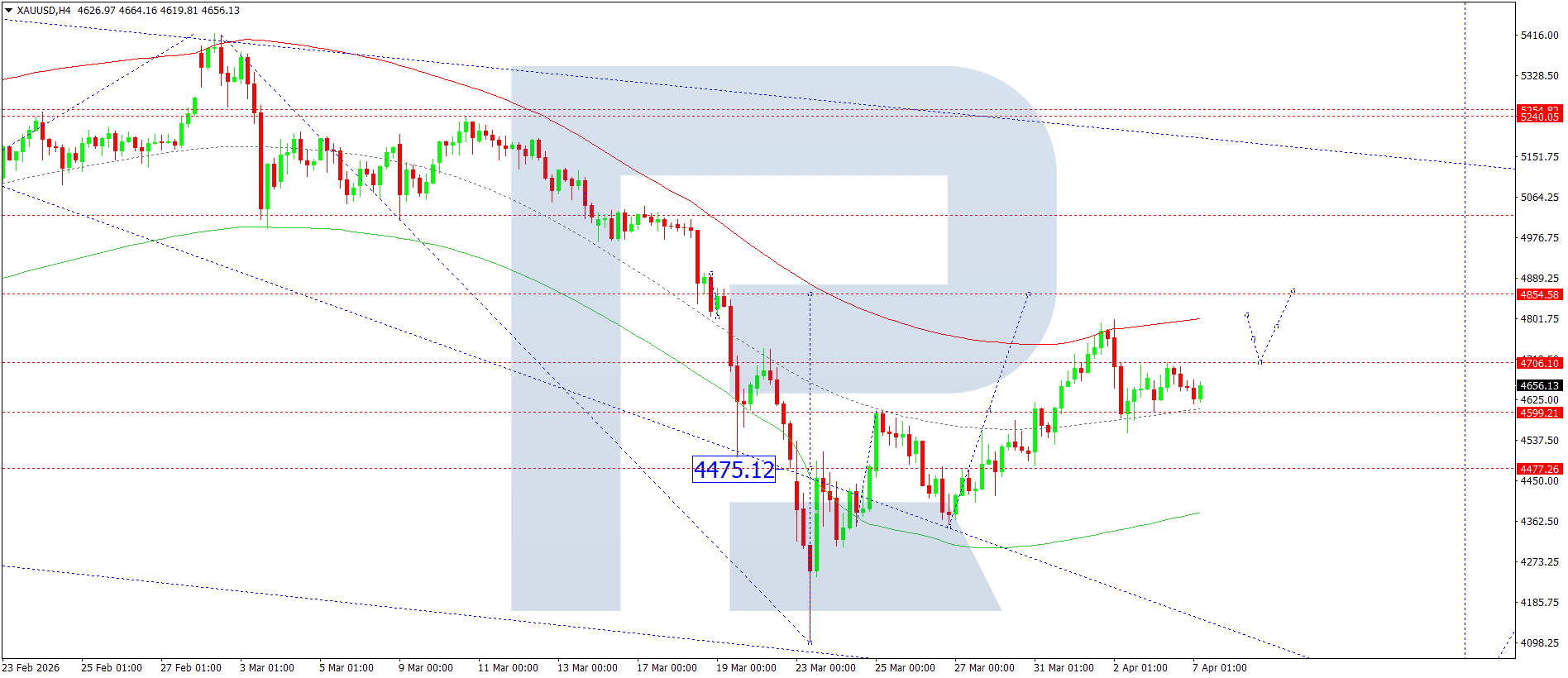 XAUUSD H4 графигінде нарық 4,700 деңгейіне дейін өсу толқынын аяқтады. Бүгін, 2026 жылғы 7 сәуірде, осы деңгей маңында консолидация диапазоны қалыптасады. Жоғарыға бұзылу 4,854 және одан әрі 5,045 деңгейіне дейін өсуге жол ашады. Балама сценарийде төменге бұзылу 4,477 деңгейіне дейін төмендеуге әкеледі.
