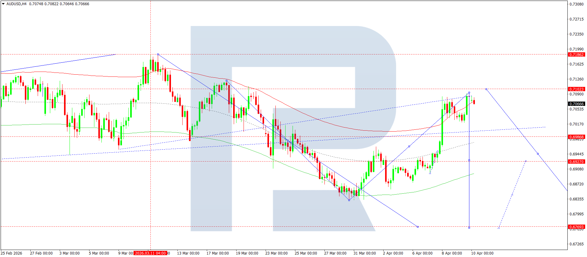 AUDUSD жұбының H4 графигінде нарық 0.7090 деңгейіне дейін өсу толқынын аяқтап, осы маңда консолидация қалыптастырды. Бүгін, 2026 жылғы 10 сәуірде, 0.6922 деңгейіне дейін төмендеу толқынының басталуы күтіледі. Егер бұл деңгей бұзылса, 0.6767 деңгейіне дейін төмендеу жалғасуы мүмкін.