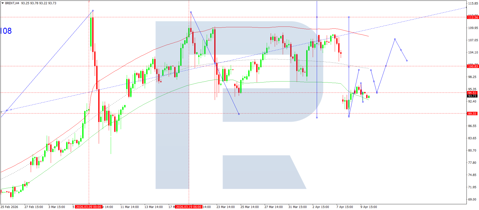 Brent мұнайының H4 графигінде нарық 88.78 деңгейіне дейін төмендеу құрылымын аяқтады. Бүгін, 2026 жылғы 10 сәуірде, осы деңгейден жоғары консолидация диапазоны қалыптасуы мүмкін. Жоғарыға бұзылу 99.90 деңгейіне дейін өсуді ашады және тренд 112.55 жергілікті мақсатқа дейін жалғасуы мүмкін. Төменге бұзылу жағдайында 80.00 деңгейіне дейін түзету, кейін 112.55 деңгейіне дейін өсу ықтимал.