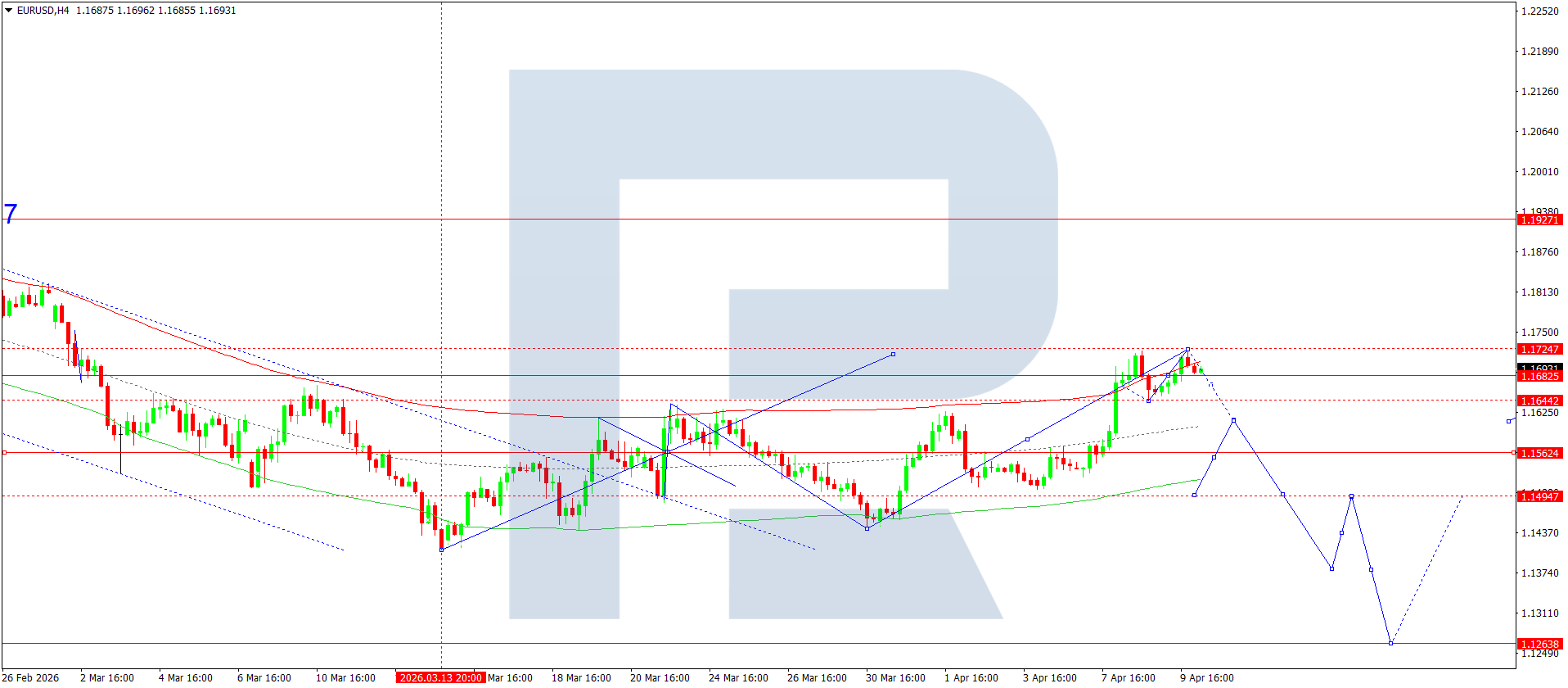 EURUSD жұбының H4 графигінде нарық 1.1682 деңгейі маңында консолидацияны жалғастыруда. Бүгін, 2026 жылғы 10 сәуірде, төменге бұзылу күтіледі. 1.1560 деңгейіне дейін төмендеу толқынының басталу ықтималдығын қарастыру орынды. Кейін 1.1640 деңгейіне дейін өсу, одан соң 1.1490 деңгейіне дейін қайта төмендеу күтіледі.