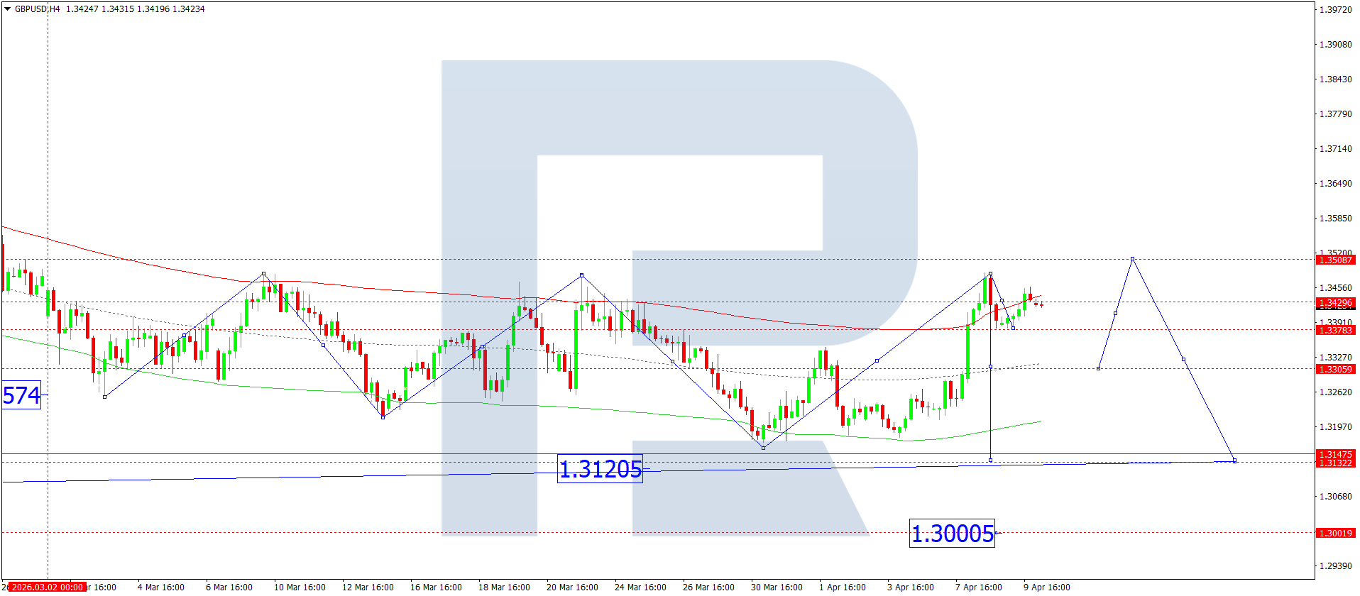 GBPUSD жұбының H4 графигінде нарық 1.3430 деңгейі маңында консолидация қалыптастыруда. Бүгін, 2026 жылғы 10 сәуірде, төменге бұзылу күтіледі. Бұл 1.3303 деңгейіне дейін төмендеуге және 1.3131 деңгейіне дейін жалғасуына әкелуі мүмкін.