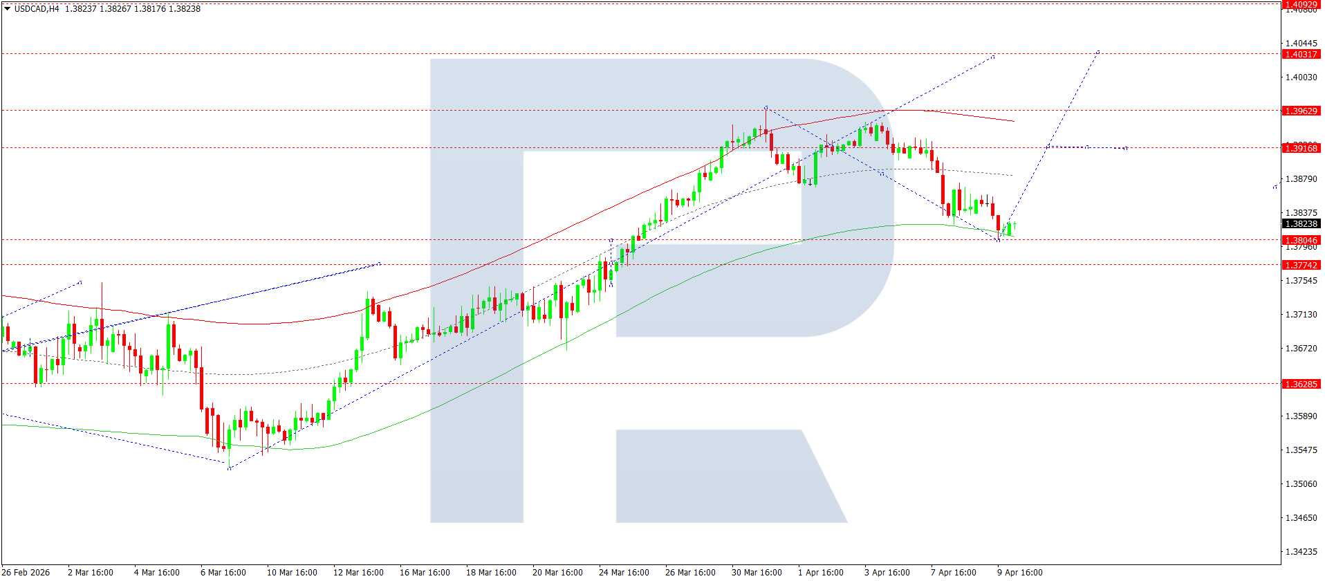 USDCAD жұбының H4 графигінде нарық 1.3808 деңгейіне дейін төмендеу толқынын аяқтады. Бүгін, 2026 жылғы 10 сәуірде, осы деңгейден жоғары консолидация қалыптасады. Төменге бұзылу 1.3707 деңгейіне дейін төмендеуге әкеледі, ал жоғарыға бұзылу 1.3919 деңгейіне дейін өсуге мүмкіндік береді.
