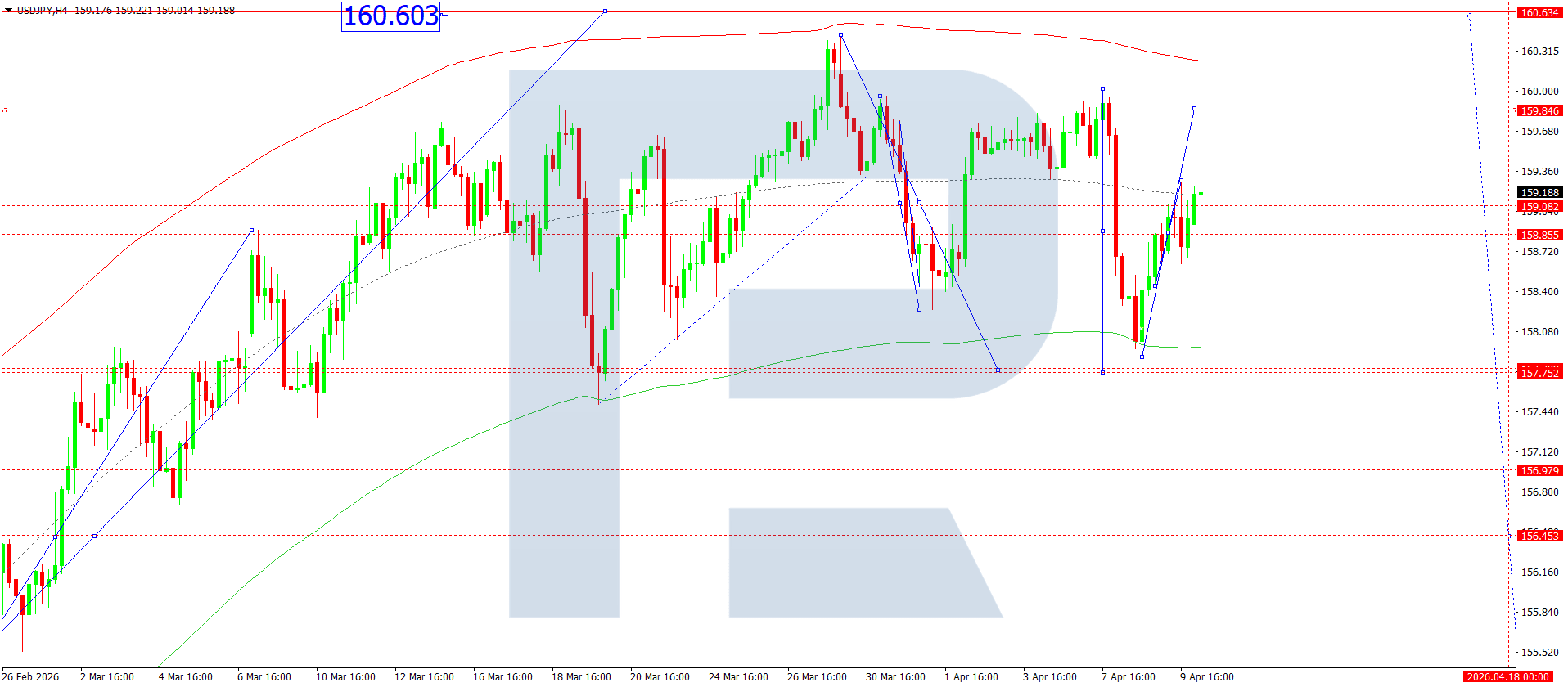 USDJPY жұбының H4 графигінде нарық 158.88 деңгейіне дейін төмендеу толқынын аяқтады. Бүгін, 2026 жылғы 10 сәуірде, өсу қозғалысы күтіледі. 159.22 деңгейіне дейін өсу толқыны басталып, 159.85 деңгейіне дейін жалғасуы мүмкін.