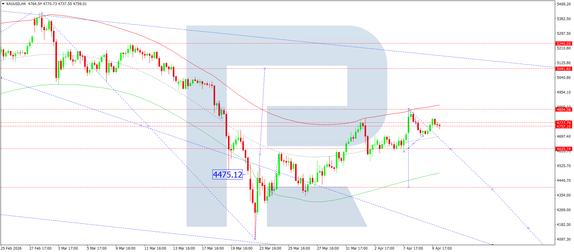 XAUUSD H4 графигінде нарық 4,854 деңгейіне дейін өсу толқынын аяқтады. Бүгін, 2026 жылғы 10 сәуірде, осы деңгейден төмен консолидация диапазоны қалыптасады. Жоғарыға бұзылу 5,000 және 5,045 деңгейіне дейін өсуге мүмкіндік береді. Балама сценарийде төменге бұзылу 4,407 деңгейіне дейін төмендеуге әкеледі.