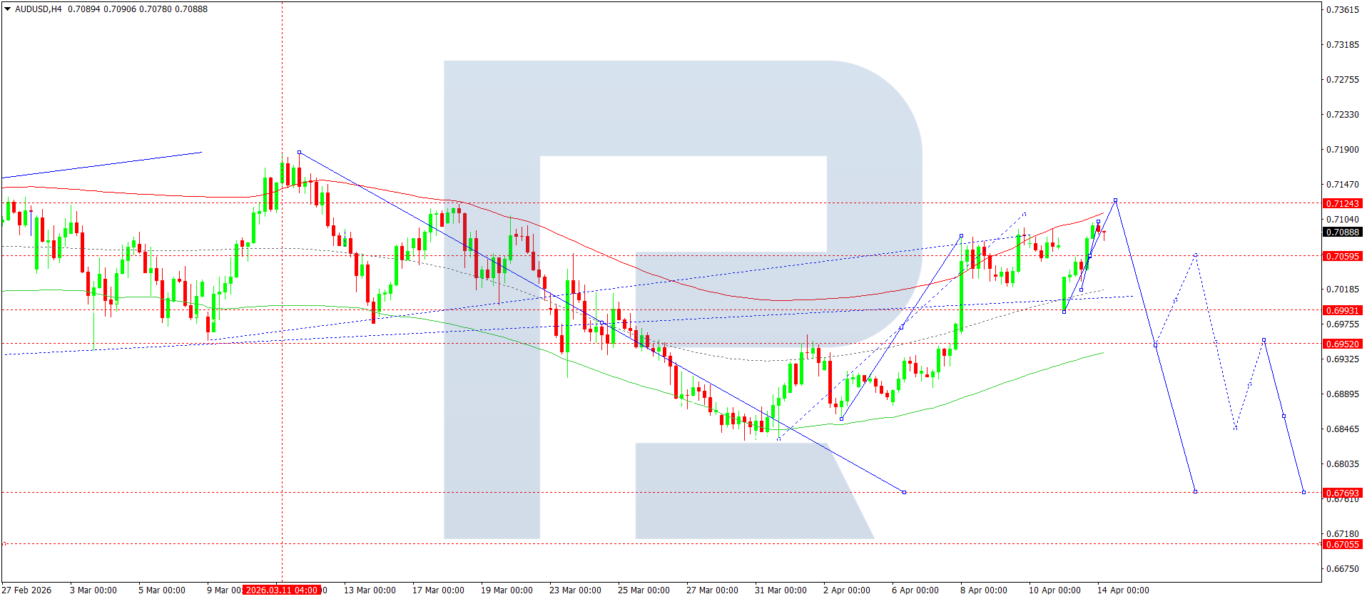 AUDUSD жұбының H4 графигінде нарық 0.6993 деңгейіне дейін төмендеп, 0.7080 деңгейіне дейін өсу жасап, 0.7060 маңында консолидация қалыптастырды. Бүгін, 2026 жылғы 14 сәуірде, 0.7123 деңгейіне дейін өсу күтіледі, содан кейін 0.6950 деңгейіне дейін төмендеу толқыны басталуы мүмкін. Егер бұл деңгей бұзылса, 0.6767 деңгейіне дейін төмендеу жалғасуы ықтимал.
