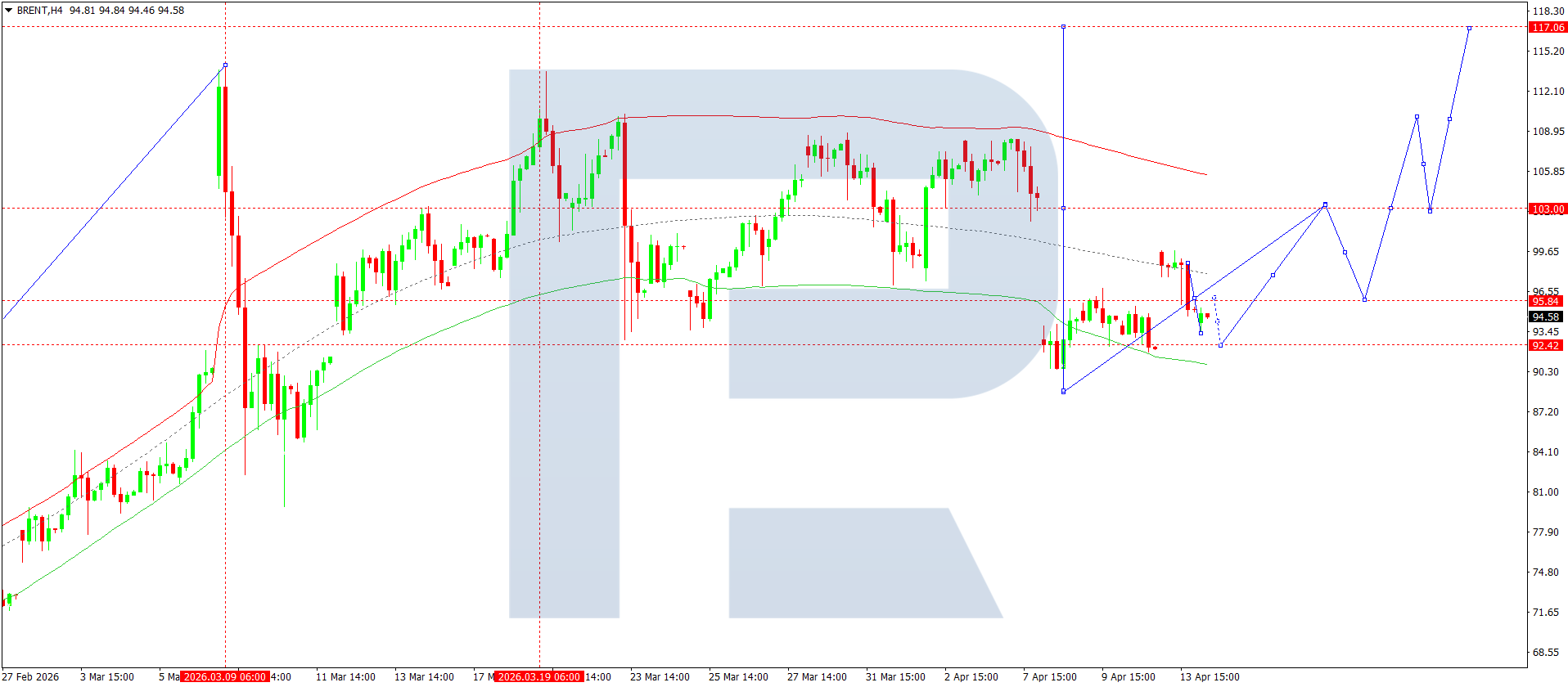 Brent мұнайының H4 графигінде нарық 98.68 деңгейіне дейін өсіп, 93.33 деңгейіне дейін төмендеді. Бүгін, 2026 жылғы 14 сәуірде, 95.85 деңгейі маңында консолидация қалыптасуы мүмкін. Жоғарыға бұзылу 103.00 деңгейіне дейін өсуді ашады және тренд 110.00 деңгейіне дейін жалғасуы ықтимал. Төменге бұзылу жағдайында 92.42 деңгейіне дейін түзету болуы мүмкін, содан кейін қайта өсу күтіледі.