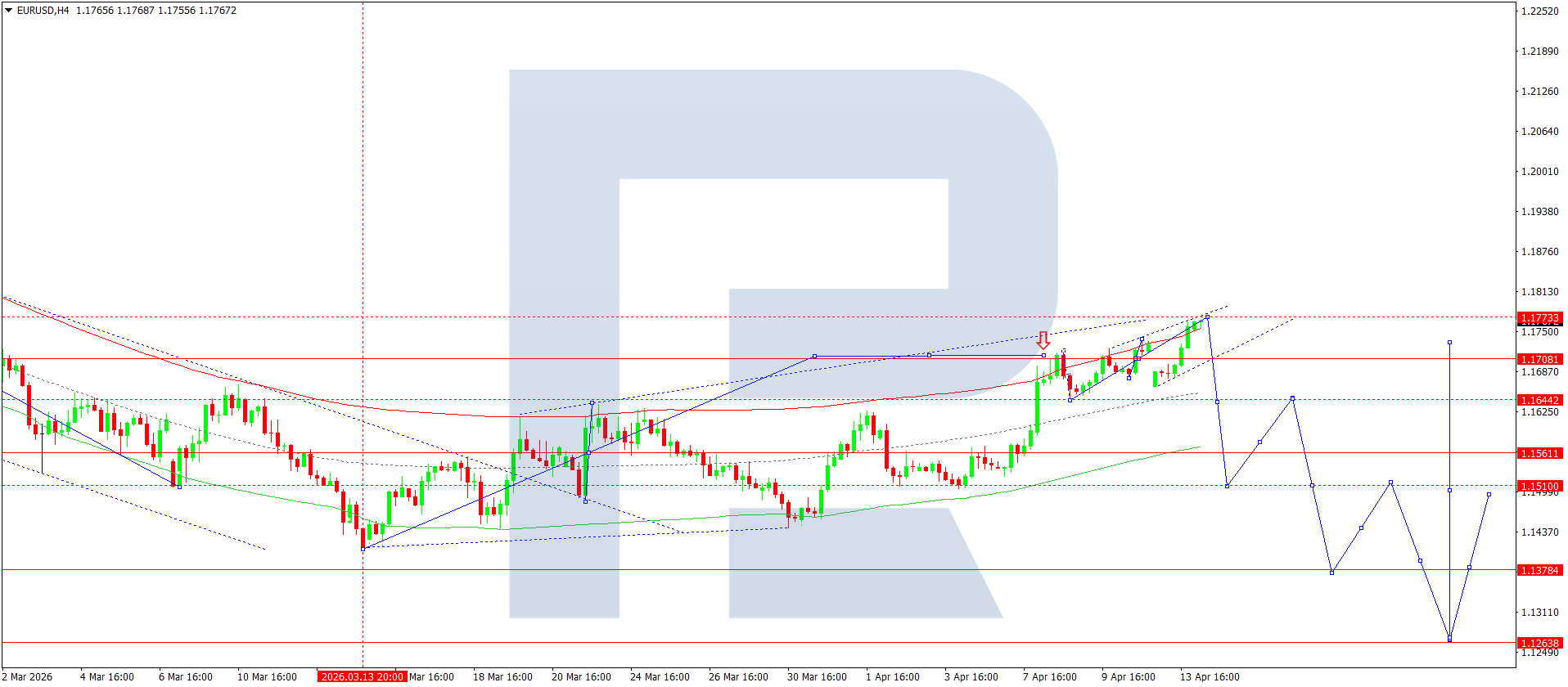 EURUSD жұбының H4 графигінде нарық 1.1700 деңгейі маңында консолидацияны жалғастыруда. Бүгін, 2026 жылғы 14 сәуірде, 1.1777 деңгейіне дейін өсу күтіледі, содан кейін 1.1644 деңгейіне төменге бұзылу орын алуы мүмкін. Төмендеу толқыны 1.1500 деңгейіне дейін жалғасуы ықтимал. Кейін 1.1640 деңгейіне дейін өсу, одан соң 1.1378 деңгейіне дейін қайта төмендеу күтіледі.