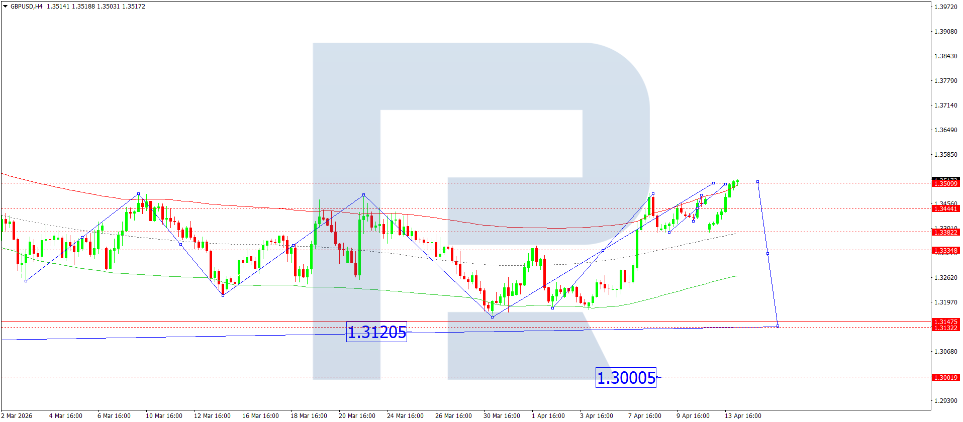 GBPUSD жұбының H4 графигінде нарық 1.3444 деңгейі маңында консолидация қалыптастыруда. Бүгін, 2026 жылғы 14 сәуірде, диапазоннан төменге бұзылу күтіледі. Бұл 1.3333 деңгейіне дейін төмендеуге және 1.3131 деңгейіне дейін жалғасуына әкелуі мүмкін.