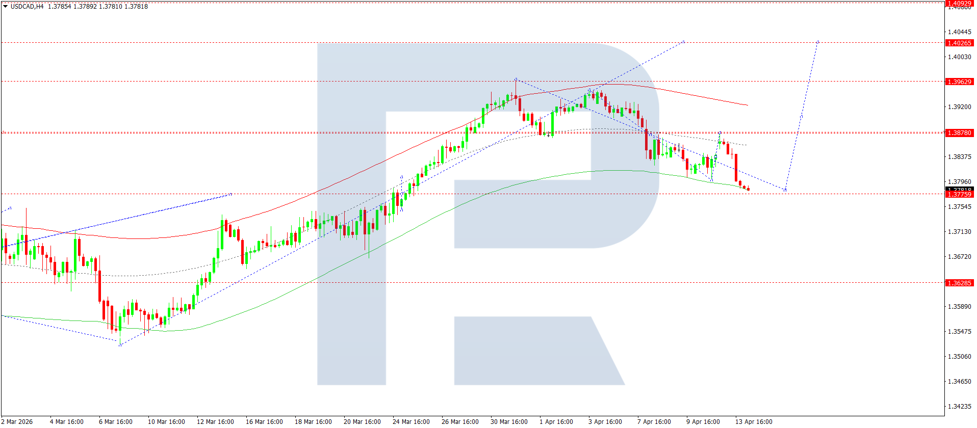 USDCAD жұбының H4 графигінде нарық 1.3780 деңгейіне дейін төмендеу құрылымын қалыптастыруда. Бүгін, 2026 жылғы 14 сәуірде, осы деңгейден жоғары консолидация күтіледі. Төменге бұзылу 1.3707 деңгейіне дейін төмендеуге әкеледі, ал жоғарыға бұзылу 1.3919 және 1.4025 деңгейлеріне дейін өсуге мүмкіндік береді.