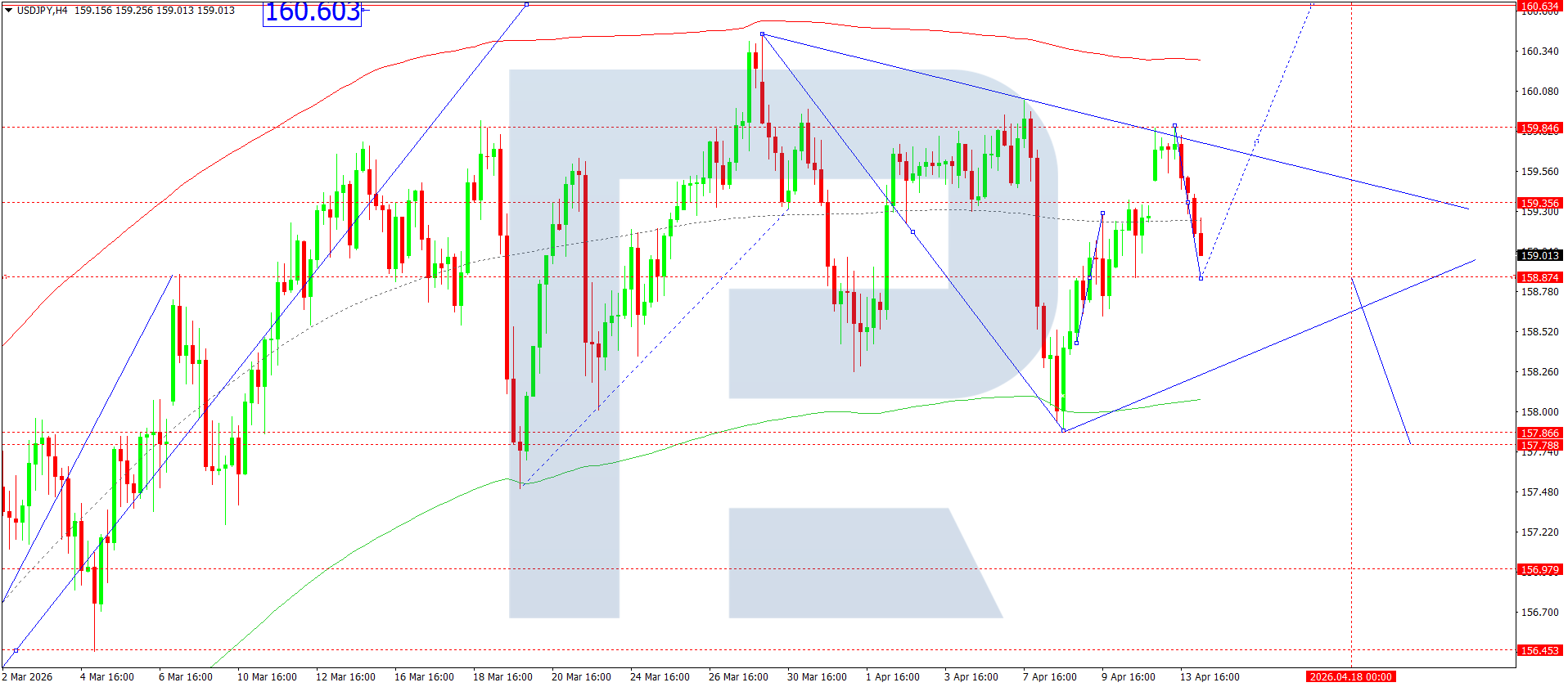 USDJPY жұбының H4 графигінде нарық 159.84 деңгейіне дейін өсу толқынын аяқтады. Бүгін, 2026 жылғы 14 сәуірде, 158.88 деңгейіне дейін төмендеу толқыны қалыптасуда. Кейін 159.35 деңгейіне дейін өсу және 160.60 деңгейіне дейін жалғасу ықтималдығы бар.