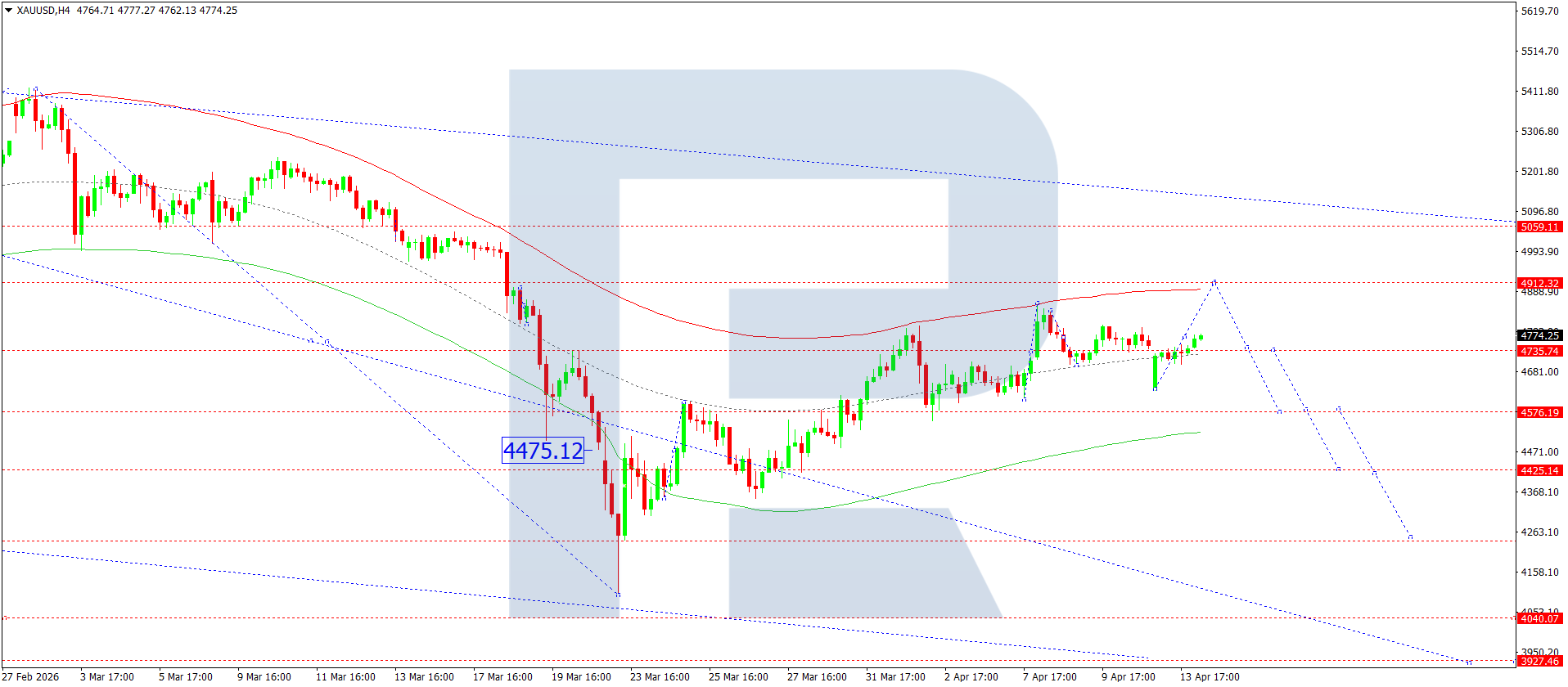 XAUUSD H4 графигінде нарық 4,737 деңгейіне дейін өсу толқынын аяқтады. Бүгін, 2026 жылғы 14 сәуірде, 4,912 деңгейіне дейін өсу күтіледі. Осы деңгей маңында консолидация қалыптасуда. Жоғарыға бұзылу 5,050 және 5,065 деңгейлеріне дейін өсуге мүмкіндік береді. Балама сценарийде төменге бұзылу 4,455 деңгейіне дейін төмендеуге әкелуі мүмкін.