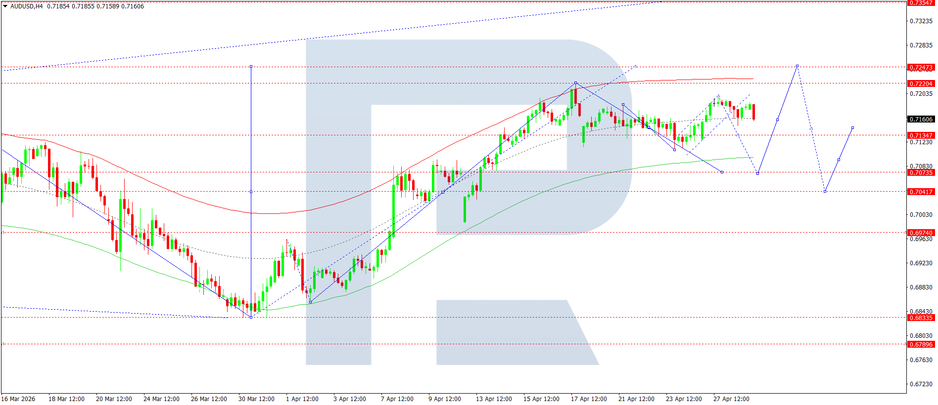AUDUSD жұбының H4 графигінде нарық 0.7164 деңгейі маңында консолидация диапазонын қалыптастырды. Бүгін, 2026 жылғы 29 сәуірде, төменге бұзылу 0.7073 деңгейіне дейін төмендеу қозғалысын ашады, әрі қарай 0.7050 деңгейіне дейін жалғасуы мүмкін.