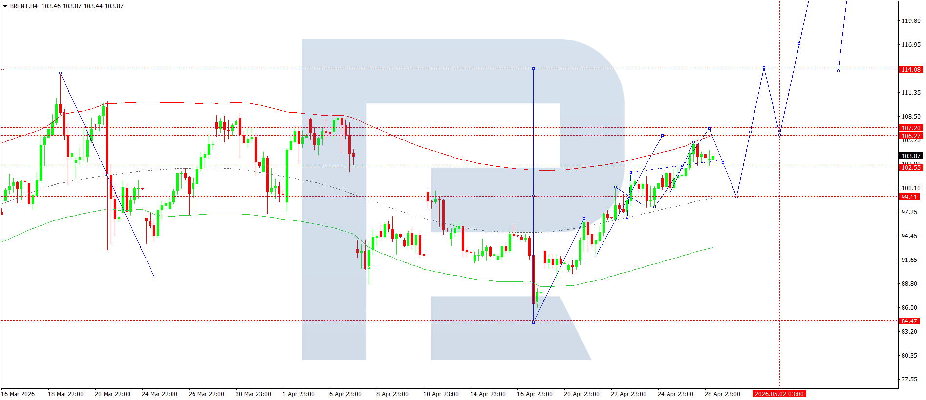 Brent мұнайының H4 графигінде нарық 105.45 деңгейіне дейін өсу құрылымын аяқтады. Бүгін, 2026 жылғы 28 сәуірде, осы деңгейден төмен жаңа консолидация диапазоны қалыптасуы мүмкін. Жоғарыға бұзылу 106.26 деңгейіне дейін өсуді, әрі қарай 107.20 деңгейіне дейін жалғасуын ашады. Ал төменге бұзылу 99.11 деңгейіне дейін түзетуге әкелуі мүмкін, кейін 114.00 деңгейіне дейін өсу күтіледі.