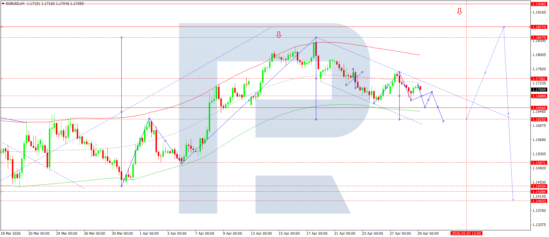 EURUSD жұбының H4 графигінде нарық 1.1678 деңгейіне дейін төмендеу толқынын аяқтап, 1.1717 деңгейіне дейін түзетілді. Бүгін, 2026 жылғы 29 сәуірде, 1.1655 деңгейіне қарай төмендеу құрылымы қалыптасуда. Кейін 1.1688 деңгейіне дейін өсу толқыны басталуы мүмкін, одан соң 1.1625 деңгейіне дейін төмендеу күтіледі.