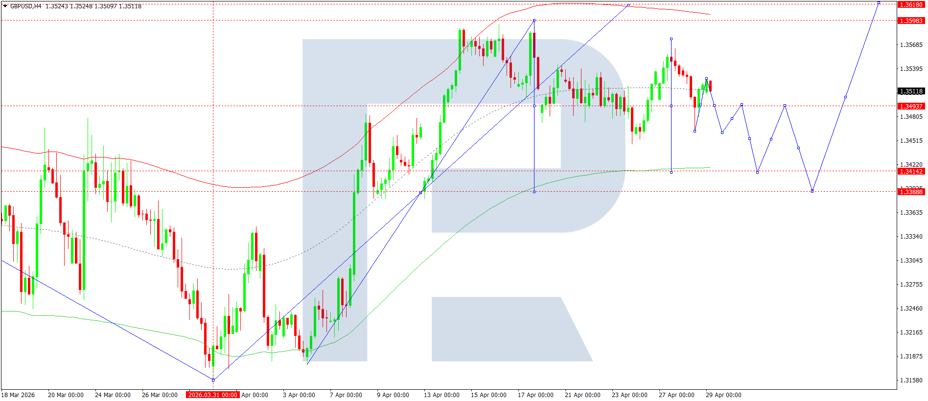 GBPUSD жұбының H4 графигінде нарық 1.3494 деңгейі маңында консолидацияны жалғастыруда, диапазон 1.3525 деңгейіне дейін кеңейді. Бүгін, 2026 жылғы 29 сәуірде, диапазон 1.3460 деңгейіне дейін төмендеуі күтіледі. Осы деңгейден төмен бұзылу 1.3415 және 1.3388 деңгейлеріне дейін төмендеу қозғалысын ашады.