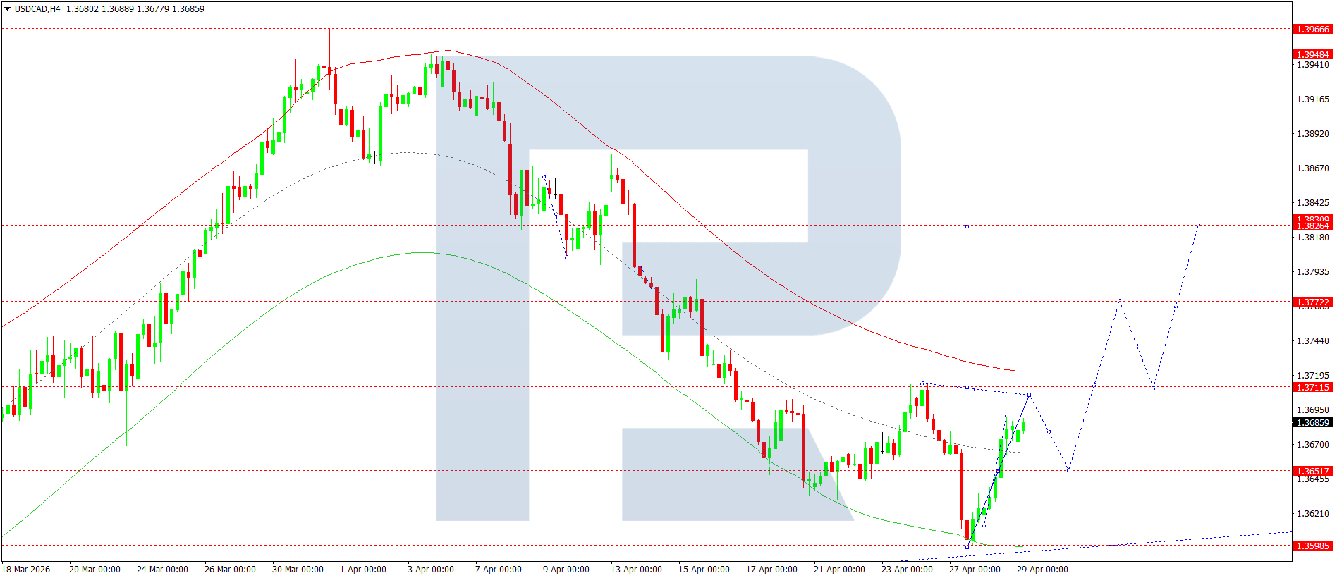 USDCAD жұбының H4 графигінде нарық 1.3599 деңгейіне дейін төмендеу құрылымын аяқтады. Бүгін, 2026 жылғы 29 сәуірде, 1.3656 деңгейінен жоғары консолидация қалыптасты. Жоғарыға бұзылу 1.3705 деңгейіне дейін өсу толқынын ашады. Кейін 1.3666 деңгейіне дейін түзету, одан соң 1.3772 және 1.3825 деңгейлеріне дейін өсу күтіледі.