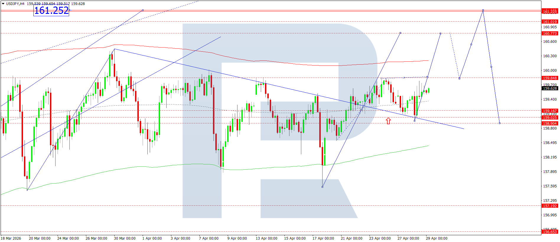 USDJPY жұбының H4 графигінде нарық 158.95 деңгейіне дейін түзетілді. Бүгін, 2026 жылғы 29 сәуірде, 159.50 деңгейі маңында консолидация қалыптасуда. 159.90 деңгейіне дейін өсу ықтимал. Кейін осы деңгейден жоғары бұзылу 160.30 және 160.77 деңгейлеріне дейін өсуді жалғастырады.