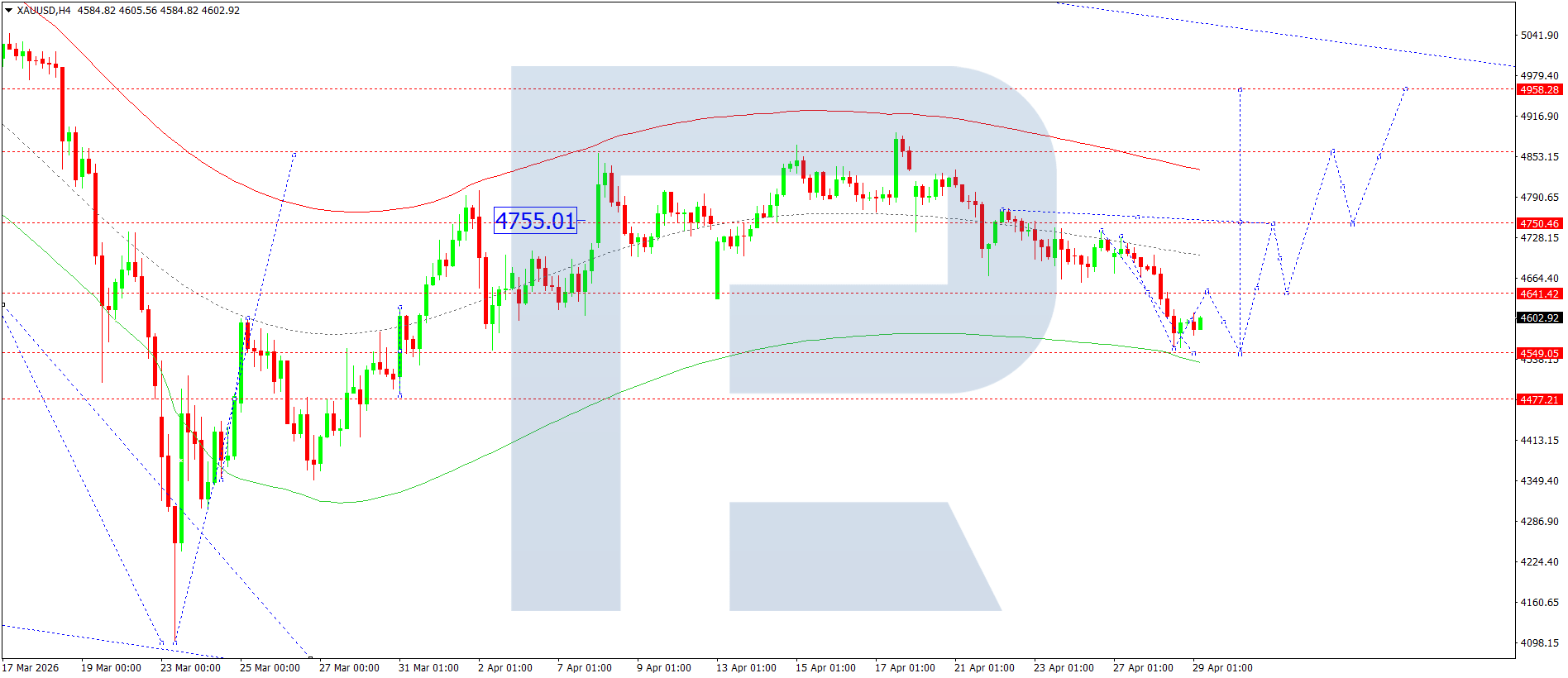 XAUUSD H4 графигінде нарық 4,626 деңгейі маңында консолидация қалыптастыруда. Бүгін, 2026 жылғы 29 сәуірде, 4,549 деңгейіне дейін төмендеу күтіледі, содан кейін 4,750 деңгейіне дейін өсу ықтимал.