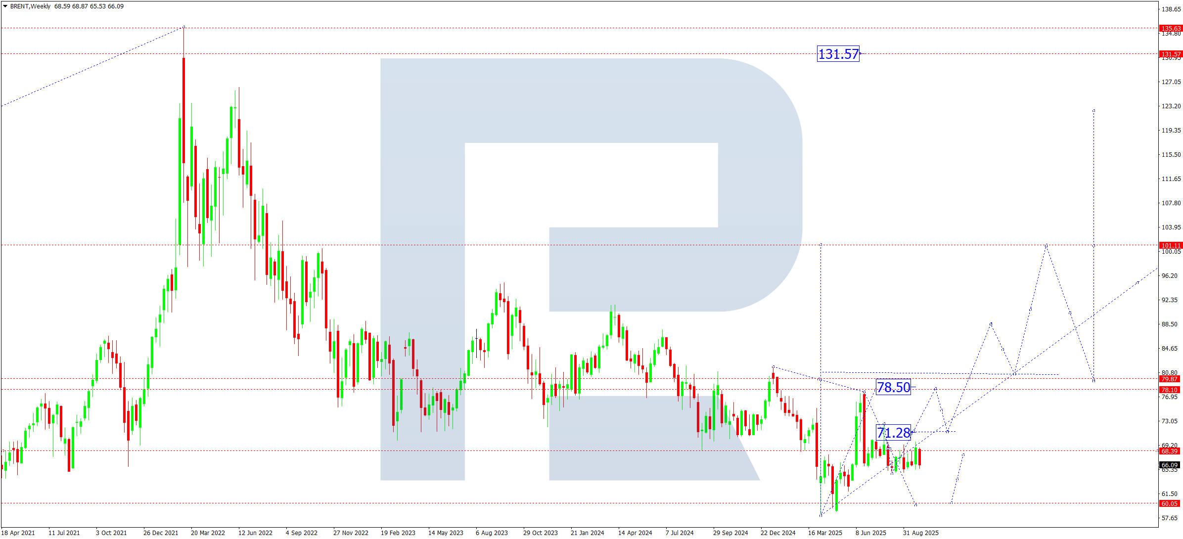 пталық графикте Brent өсу толқынын құруда, ең жақын мақсат — 78.50. Қазір нарық төртінші түзету толқынын дамытып, 68.40 маңында консолидацияда.
