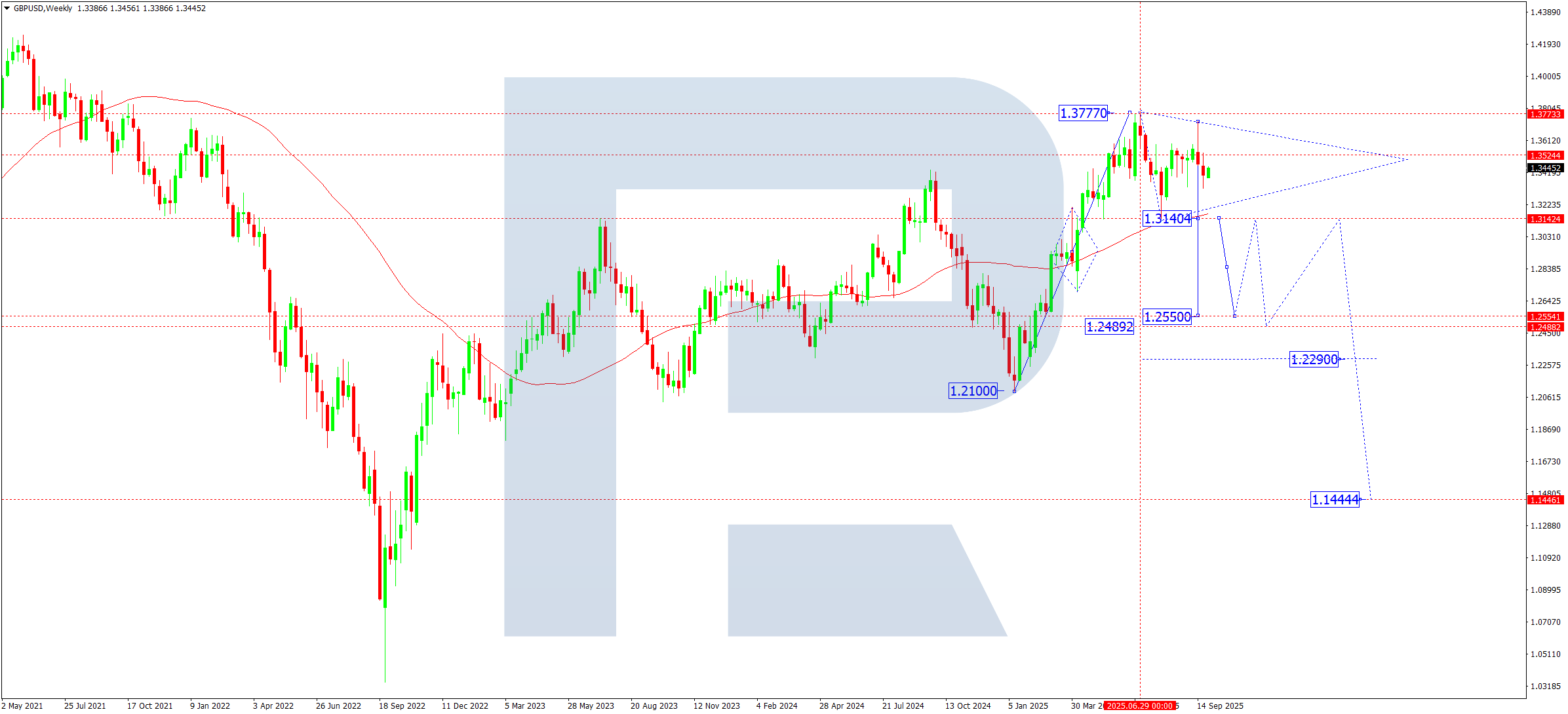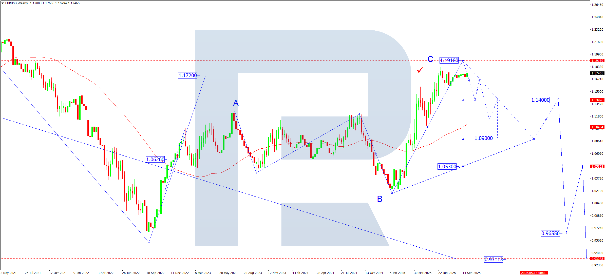 Апталық графикте EURUSD жұбы 2025 жылдың қаңтарында басталған C-толқынның ұзартылған бес толқынды құрылымын 1.0180–1.1918 аралығында аяқтады. Нарық 1.1645-ке дейін төмендеуші импульс құрды. Қазанда осы импульстің 1.1770-ке дейін түзетілуі күтіледі. Түзету аяқталған соң, 1.1400 бағытына жаңа төмендеуші импульс күтеміз. Бұл деңгейді төмен бағыттағы бірінші толқынның алғашқы аяғы ретінде қарастырамыз. Толық есептелген толқындық құрылым графикте көрсетілген: