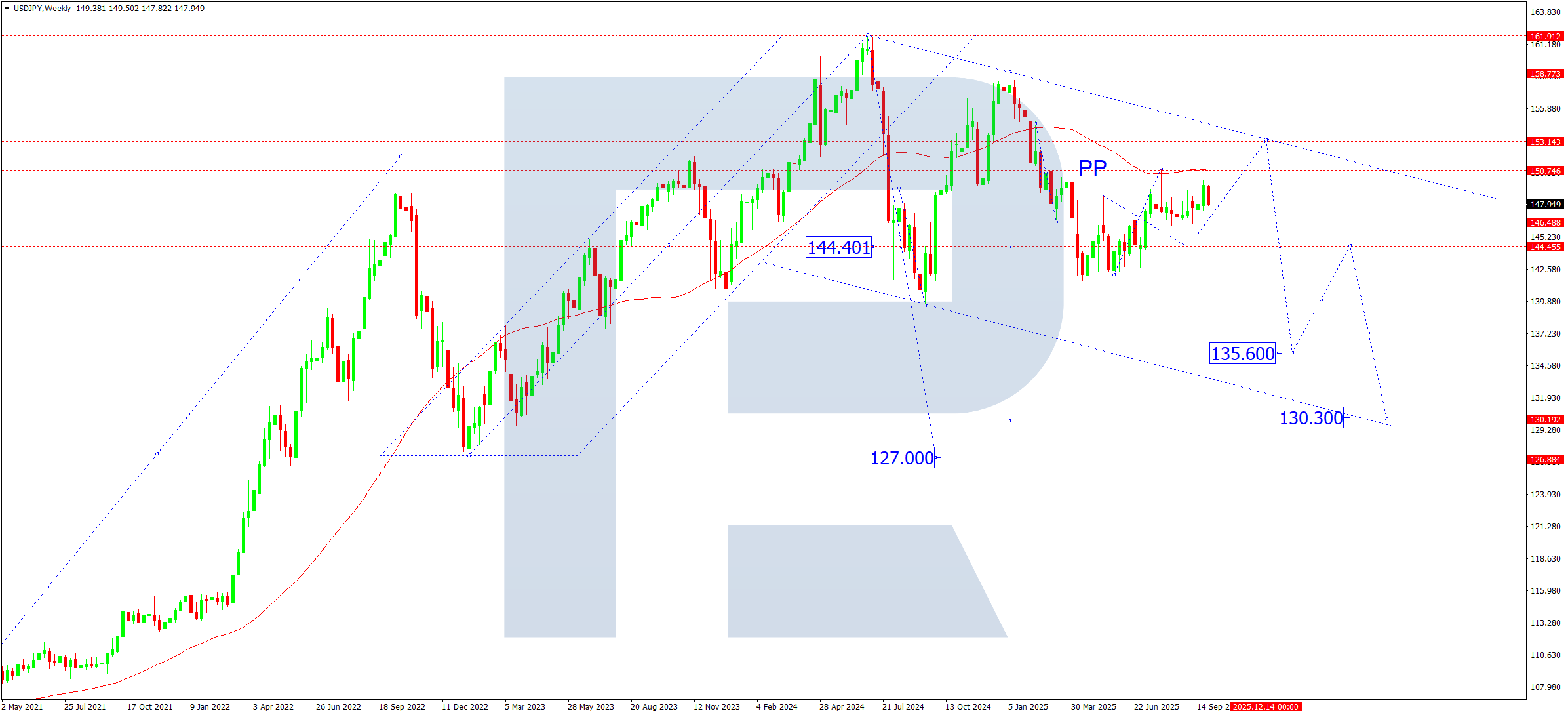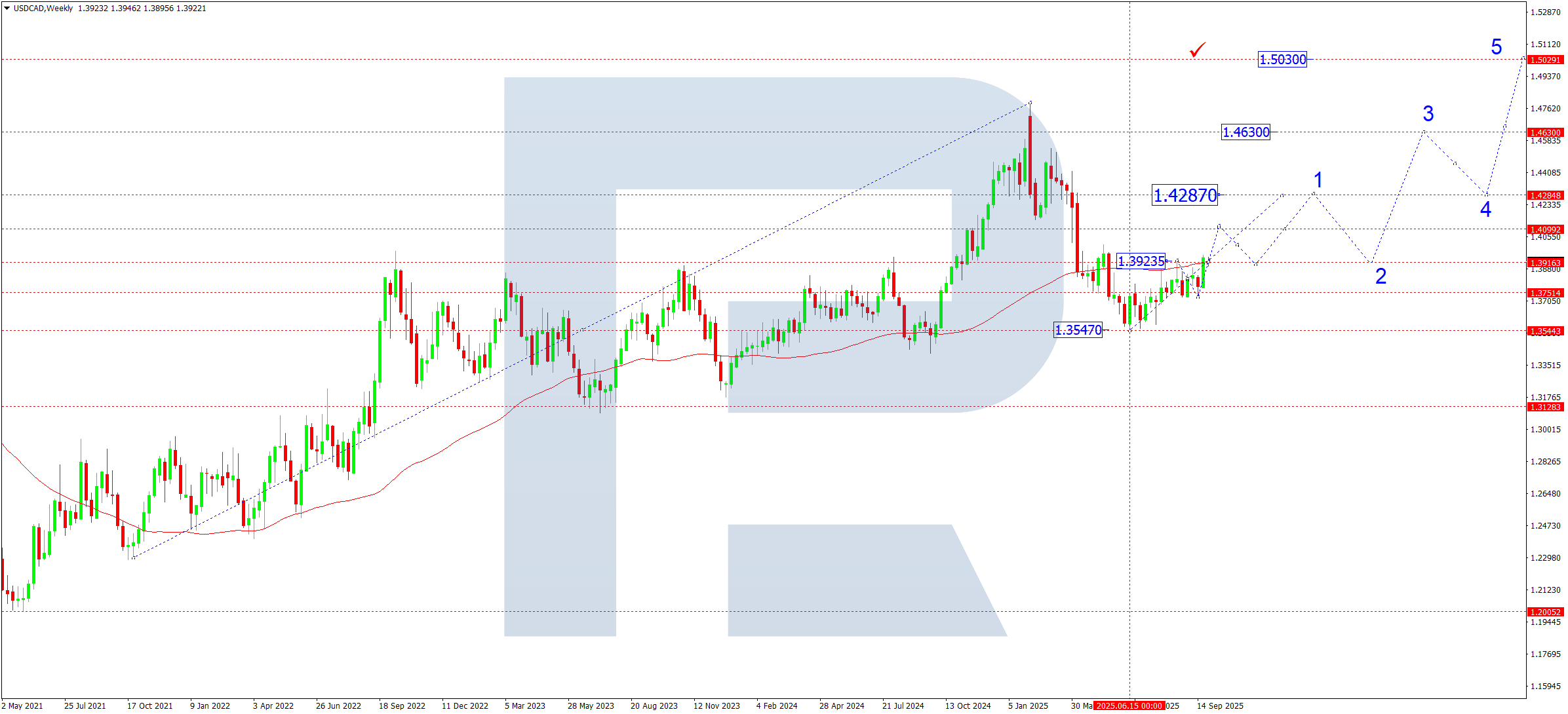 Апталық графикте USDCAD 1.3923-ке дейін өсу жасап, 1.3700-ге түзетілді. Кейін нарық 1.3930-ға дейін қайта өсті. Қазанда 1.3930-дан жоғары бұзылу және 1.4100 жергілікті мақсатына дейін өсу толқынының жалғасуы күтіледі. Осы деңгейге жеткен соң, 1.3930 маңына (4-толқын) түзету ықтимал. 1.4100-ден жоғары орнығу 1.4280 бағытындағы бесінші өсу толқыны әлеуетін ашады. Біз бұл өсу циклін 1.5030 бағытына қарай трендтегі алғашқы өсу толқыны ретінде бағалаймыз.