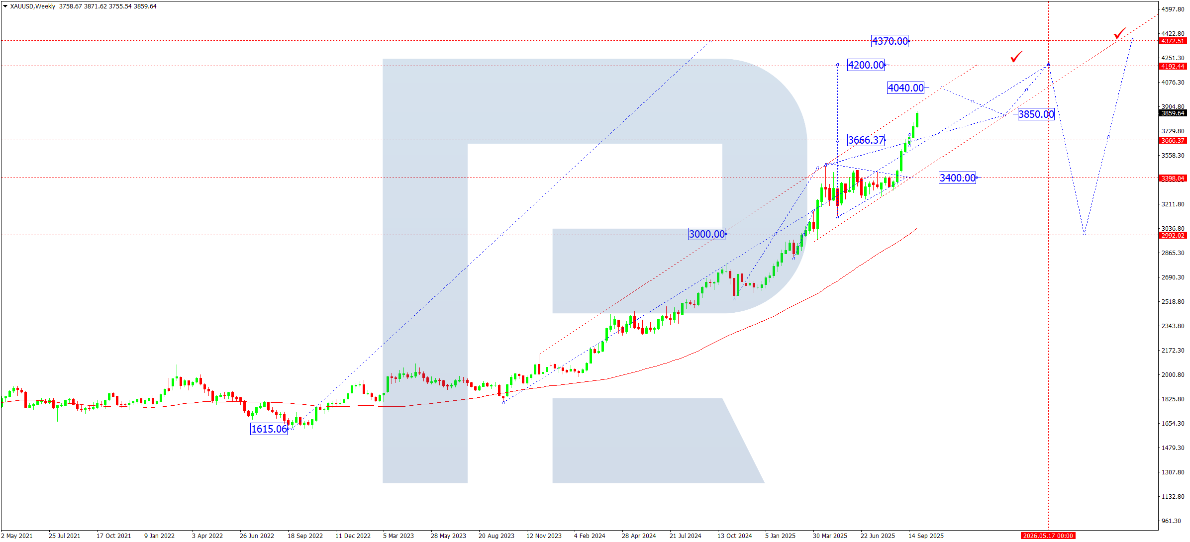 Апталық графикте алтын «Жалауды» (Pennant) жоғары бұзып, өсуші арнаның жоғарғы шекарасы — 4,040 бағытына қозғалысты жалғастыруда. Қазанда осы мақсатқа жету әлеуеті сақталады, содан кейін тренд 4,200 — ең жақын жергілікті мақсатқа дейін кеңеюі мүмкін.
