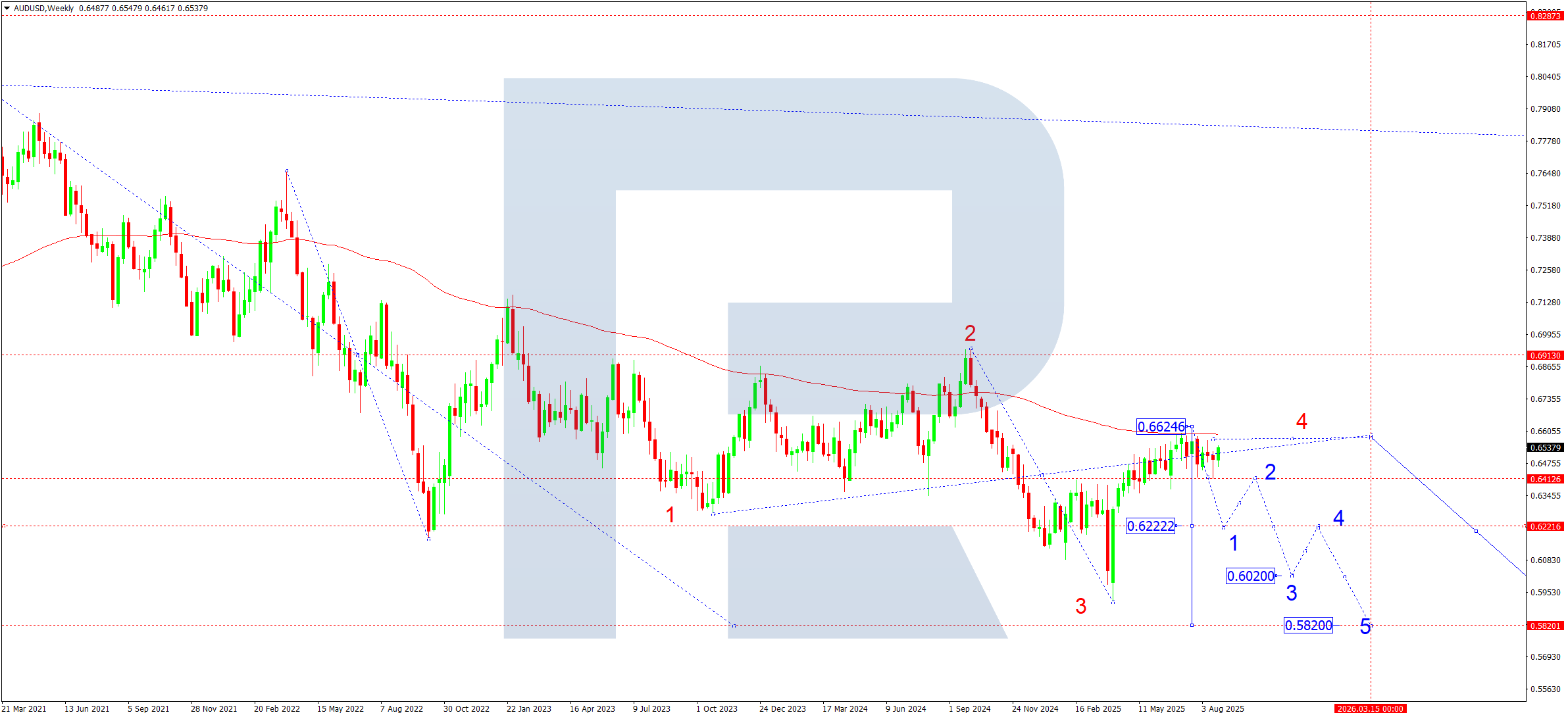Апталық графикте AUDUSD жұбы 0.6624 деңгейінде түзетуді аяқтады. Қазір осы деңгейдің астында консолидация аймағы қалыптасуда. SMA50 өсу жалғастыру әрекеттерін тежеп тұр. Қыркүйекте 0.6410 деңгейінен төмен бұзылу ықтимал, бұл 0.6222 деңгейін алғашқы мақсат ретінде ашады. Біз кеңірек төмендеу тренді аясындағы соңғы (бесінші) төмендеу толқынының басталуын 0.5820 мақсатына қарай деп бағалаймыз.