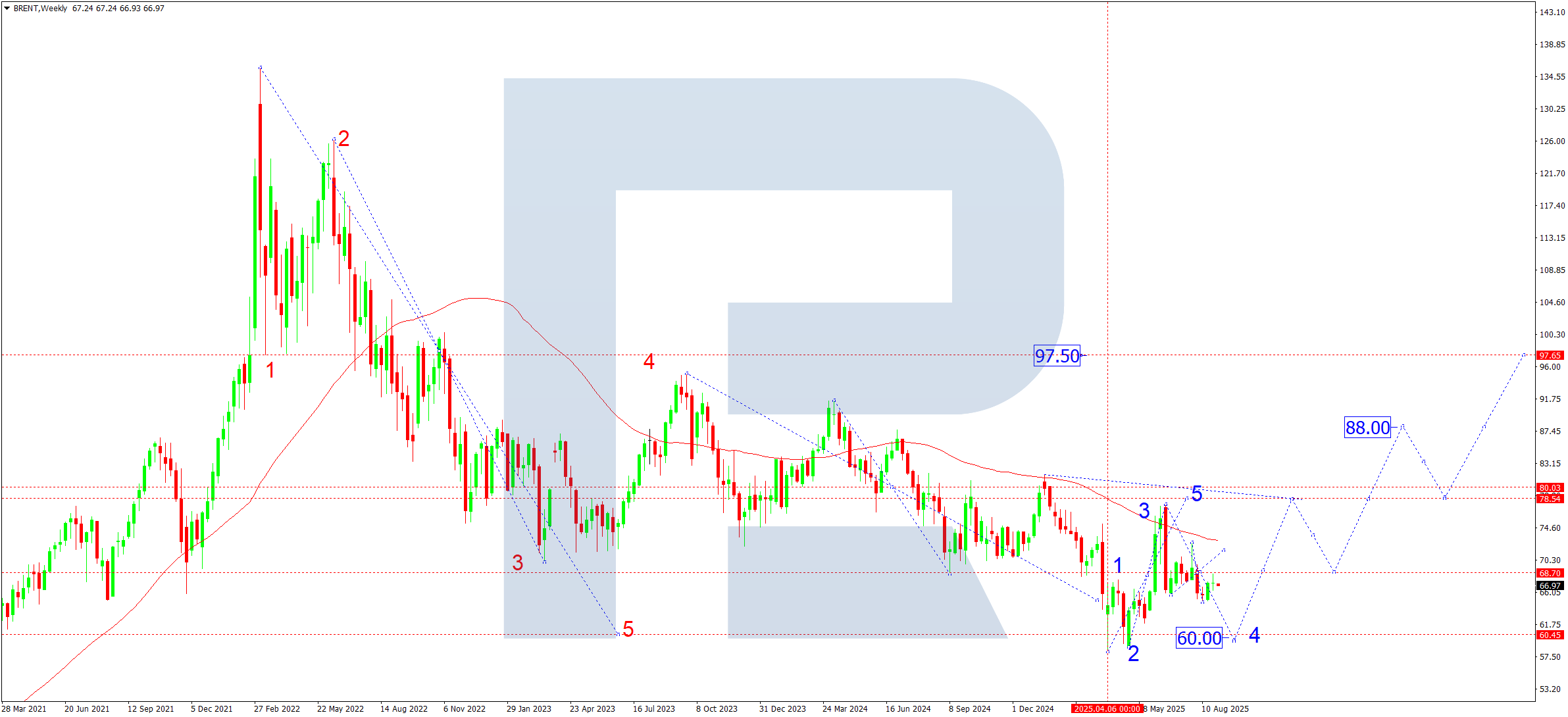 Апталық графикте Brent айқын жоғары толқындық құрылымды көрсетуде. Алғашқы жоғары мақсат 78.50 маңында. Осы деңгейге жеткен соң, 68.70 деңгейіне дейін түзету ықтимал, мұнда SMA50 қолдау көрсетуі мүмкін. Келесі сценарий 88.00 бағытындағы үшінші өсу толқынын және 97.50 бағытындағы бесінші толқынды болжайды. Қазіргі 68.70 маңы негізгі қарсылық ретінде әрекет етеді; одан жоғары бұзылу жоғары әлеуетті белсендіреді. Тарихи тұрғыдан бұл аймақ жиі бұрылу нүктесі ретінде қызмет еткен. Терең құлдырау сыртқы шоксыз екіталай; дегенмен, 68.70 қолдауынан төмен бұзылу 60.00 деңгейін тестілеуге мүмкіндік береді — бұл бірқатар экспорттаушы елдер үшін түзетуші төртінші толқынның аяқталуын білдіруі мүмкін психологиялық және іргелі минимум.