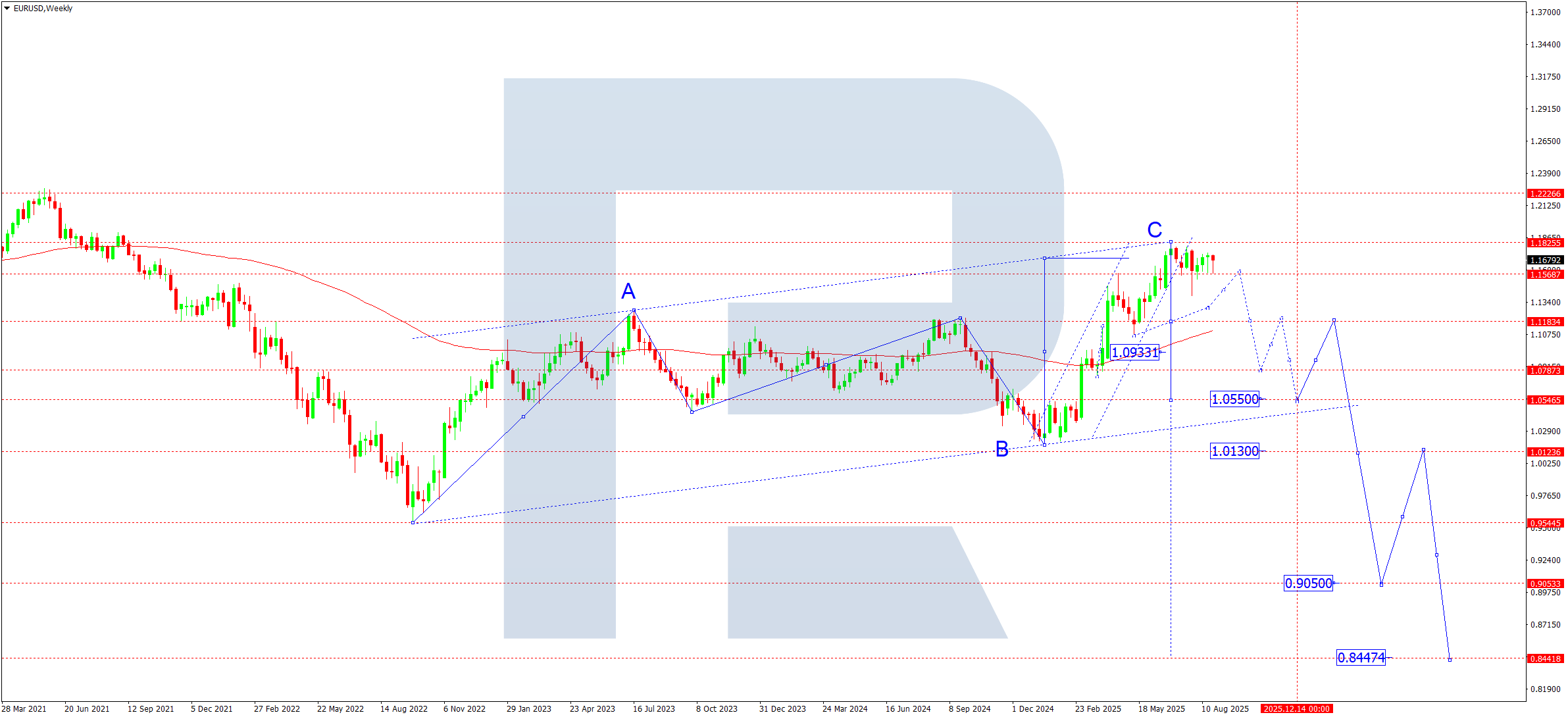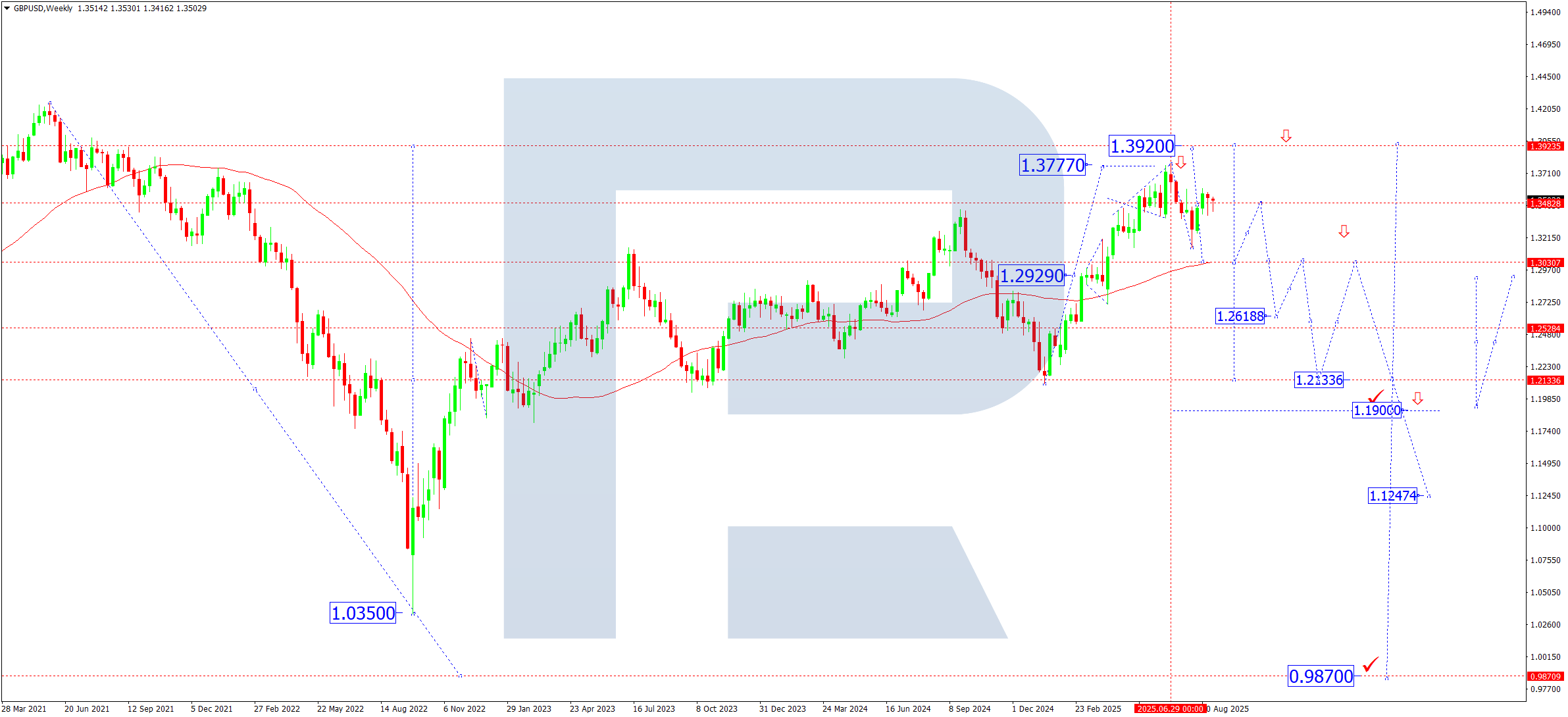 Апталық графикте EURUSD жұбы 2025 жылдың қаңтарында басталған 1.0180–1.1825 диапазоны ішіндегі бес толқынды C-толқын құрылымын аяқтады. Нарық қазіргі уақытта 1.1570 маңында консолидацияда. Қыркүйекте 1.1300 бағытында төмендеу толқыны ықтимал, кейін 1.1570 деңгейін төменнен қайта тестілеу күтіледі.