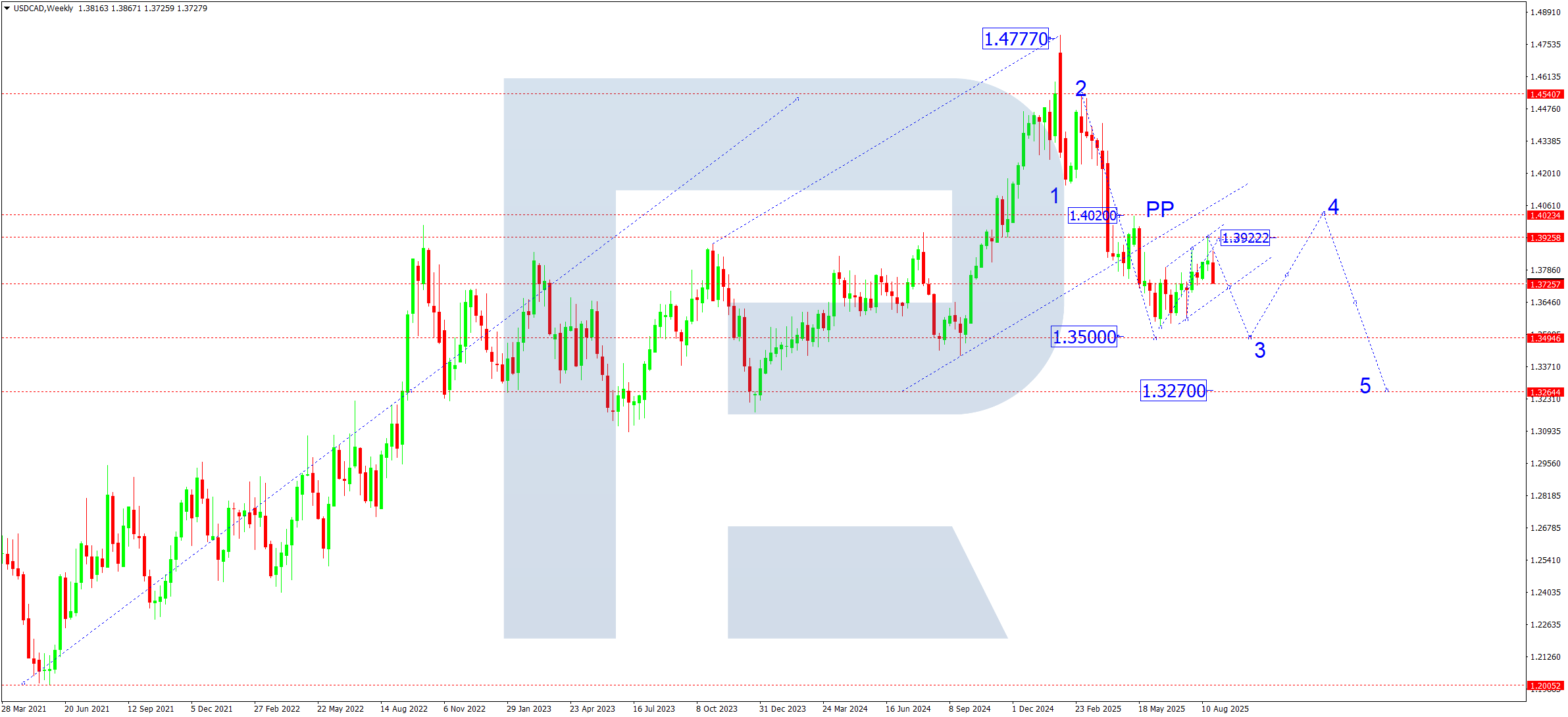 Апталық графикте USDCAD жұбы «Жалау» түзету үлгісін құрды. SMA50 бағаны 1.3922 деңгейінен төмен итерді. Қыркүйекте жұптың 1.3720-ден төмен бұзылып, үлгі арнасынан шығуы және аюлы импульсты күшейтуі күтіледі. 1.3720 деңгейінен төмен бұзылу 1.3500 жергілікті мақсатына дейін төмендеу әлеуетін ашады. Осы деңгейге жеткен соң, 1.4020 аймағына (4-толқын) дейін түзету ықтимал. Бұл сценарий іске асса, келесіде шамамен 1.3270 мақсаты бар бесінші төмендеу толқыны дамуы мүмкін.
