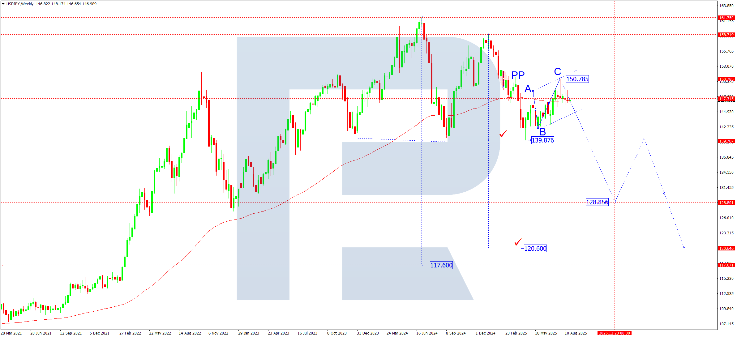 Апталық графикте жұп A-B-C түзетуін аяқтап, 150.78-ге жетті. Нарық бұрылу нүктесін төменнен қайта тестіледі. C-толқынының бес толқынды құрылымы толық қалыптасты, түзету «Жалау» үлгісіне ұқсайды. Қазір нарық 145.00 деңгейінен төмен бұзылуға және 139.87 бағытында жаңа төмендеуді бастауға дайын көрінеді; бұл аюлы импульстың тек алғашқы жартысы ретінде қарастырылады. Қыркүйекте 140.00 маңында тар консолидация пайда болуы мүмкін. Төменге бұзылу жыл соңына қарай 128.88 жергілікті мақсатына қозғалысты белсендіреді.
