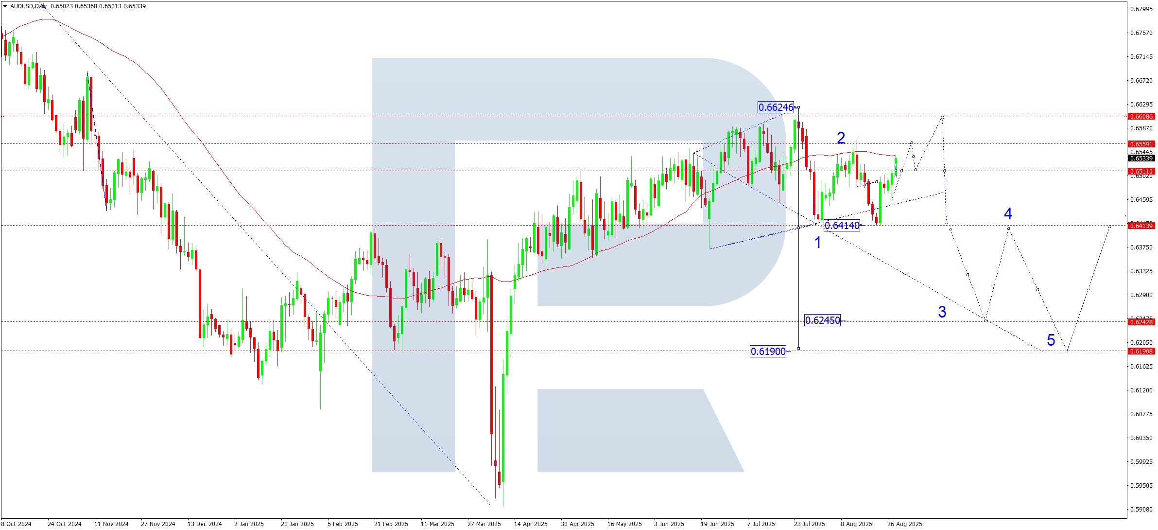 Күндік графикте AUDUSD жұбы 0.6500 маңында кең консолидацияда тұр. Нарық 0.6511 жоғары серпіліс жасады, бұл 0.6555–0.6600 жоғарғы шекарасына дейін өсу әлеуетін көрсетеді. Бұдан кейін 0.6400 деңгейіне дейін төмендеу әлі де мүмкін. Төменге бұзылу трендтің 0.6245 жергілікті мақсатына дейін жалғасуына жол ашады.