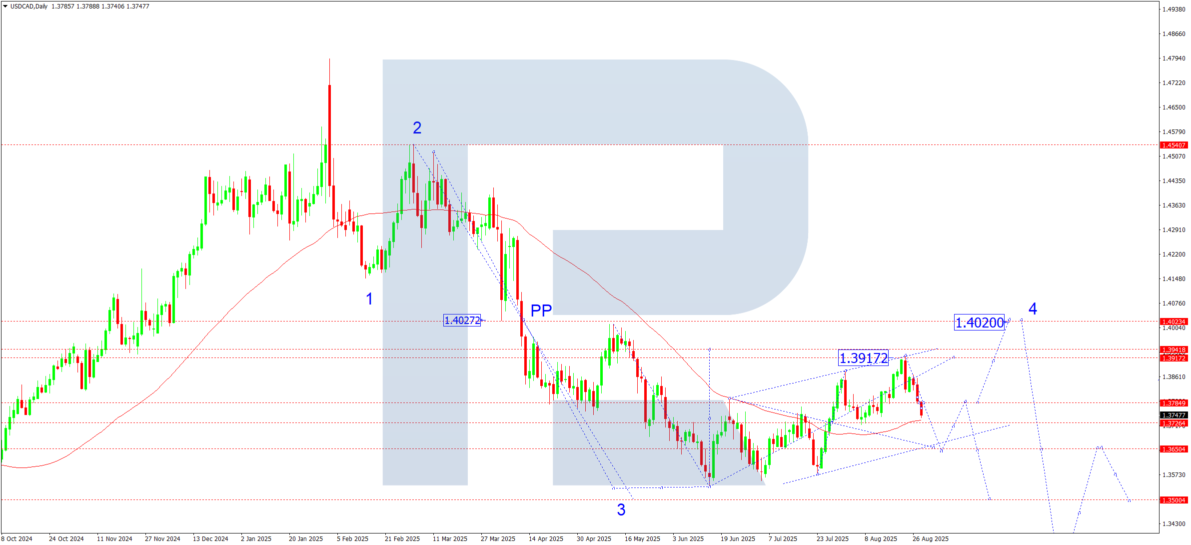 Күндік графикте USDCAD жұбы үшінші өсу толқынында түзету қозғалысын жалғастыруда, алғашқы мақсат — кемінде 1.3727 (жоғарыдан тестілеу – бұрылыс нүктесі). Осы деңгейде SMA50 қолдау көрсетіп, жұпты 1.3940 деңгейіне дейін қайта көтеруі мүмкін, бұл негізгі түзету мақсаты болып саналады.