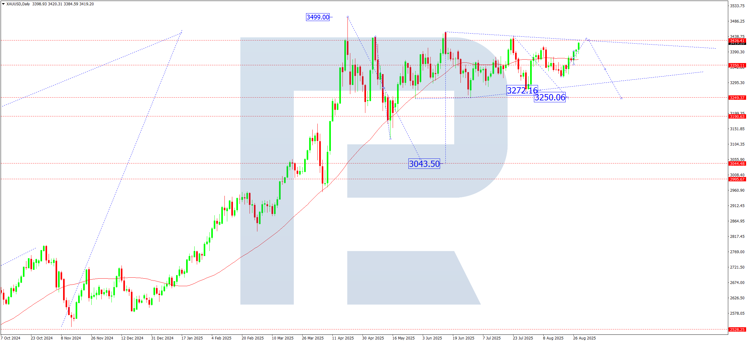 Күндік графикте алтын 3 373 деңгейінде қолдау тапты, мұнда SMA50 де орналасқан. Алдағы аптада өсу толқыны консолидация диапазонының жоғарғы шекарасы – 3 433 деңгейіне қарай жалғасуы күтіледі. Жоғарыға серпіліс 3 474 дейінгі өсуге жол ашады. Қазіргі құрылым симметриялық үшбұрыштың жоғарғы бөлігін құрап отыр, бұл жиі алдағы ірі түзетудің сигналы болып саналады.