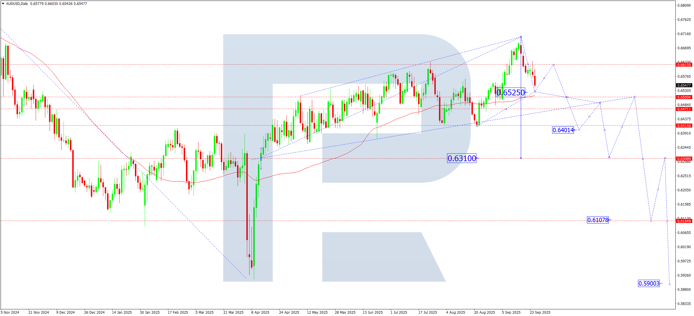 Күндік графикте AUDUSD жұбы 0.6525-ке дейінгі алғашқы төмендеуді аяқтады. Осы аптада 0.6600-ге дейін (төменнен тест) түзету ықтимал. Түзету аяқталғаннан кейін келесі төмендеу толқыны күтіледі: баға 0.6500-ден төмен бұзылып, трендті 0.6400-ге дейін жалғастырады. Бүкіл аюлы құрылымның жергілікті мақсаты 0.6310 маңында (жоғары дәрежелі тренд мақсаты).