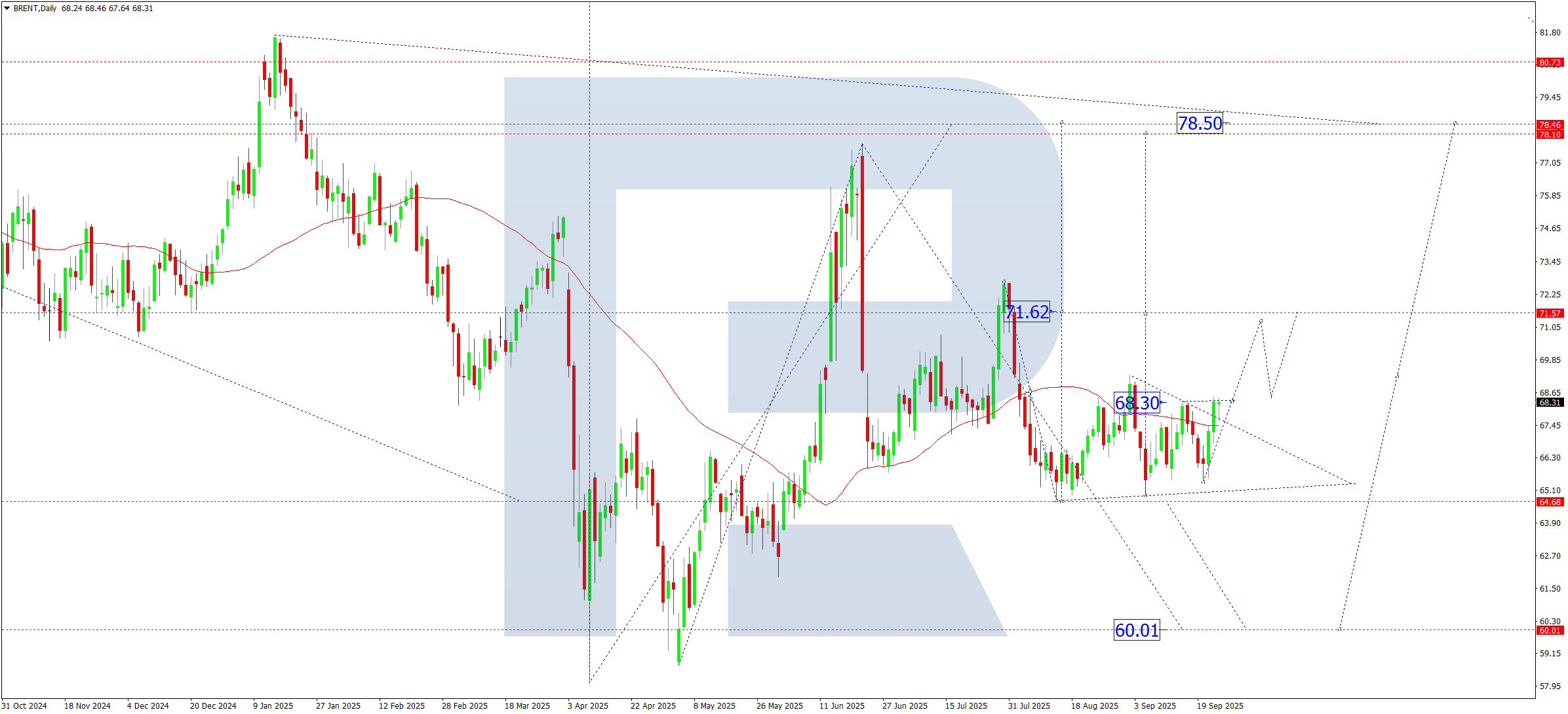 Күндік графикте Brent 68.30 деңгейінен жоғары бұзылып, осы деңгейдің үстінде консолидация кезеңіне өтті. Осылайша, мұнай ұзақ мерзімді бүйірлік диапазоннан шығып, орта мерзімді өсу толқыны ықтималдығын арттырды. Осы аптада 71.62 бағытына, әрі қарай 78.50-ге дейін кеңею ықтималдығымен өсудің жалғасуы қисынды сценарий.