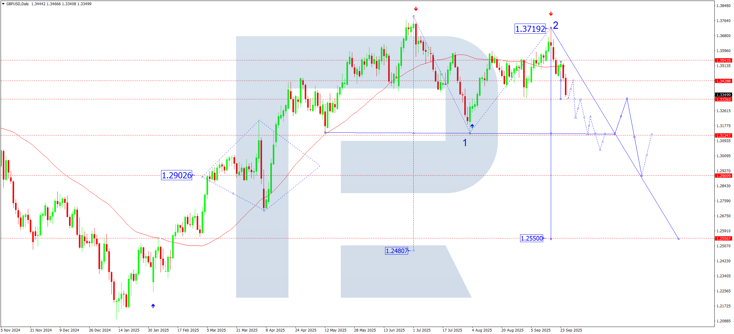 Күндік графикте GBPUSD жұбы үшінші төмендеу толқынының алғашқы құрылымын 1.3326 деңгейіне дейін аяқтады. Осы аптада 1.3428 деңгейіне дейін түзету ықтимал. Түзету аяқталғаннан кейін 1.3222-ге дейін төмендеу жалғасып, қозғалыс 1.3130 бағытында тереңдеуі мүмкін. Бұл ағымдағы төмендеуші толқынның тек жартысы. Жергілікті трендтің мақсаты бұдан әлдеқайда төмен — шамамен 1.2550.