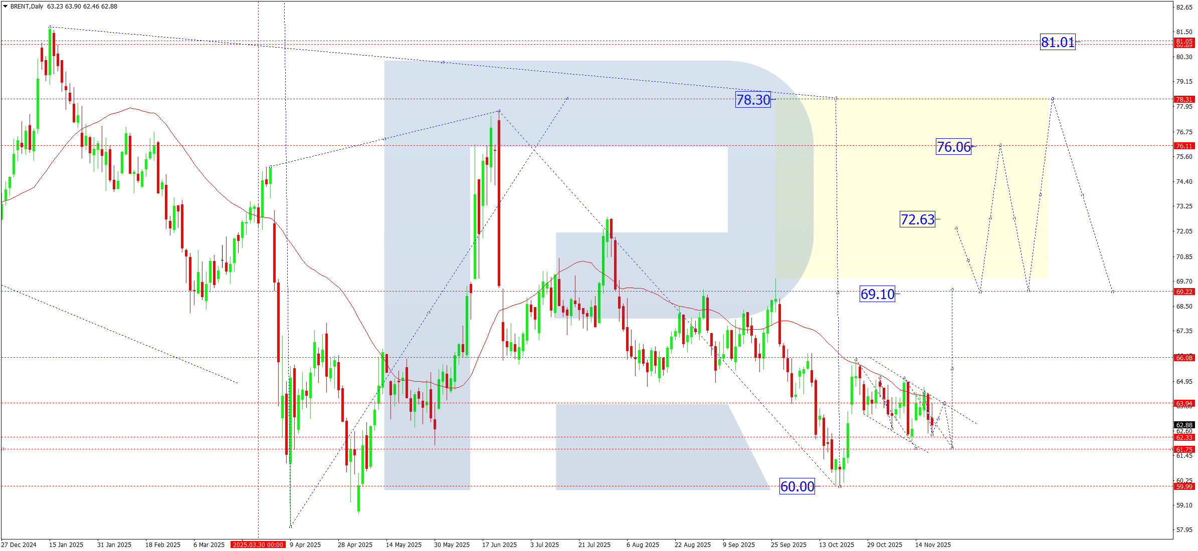 Күндік графикте Brent бағасы 64.00 үстінде орныға алмады. 63.40 деңгейінен төмен бұзылып, нарық 61.75-ке дейінгі тағы бір түзету аяғын дамытуды меңзейді. Түзету аяқталған соң 66.00 бағытымен жаңа бұқалық толқын басталуы мүмкін, әрі қозғалыс 69.10 жергілікті мақсатына дейін жалғасуы ықтимал.