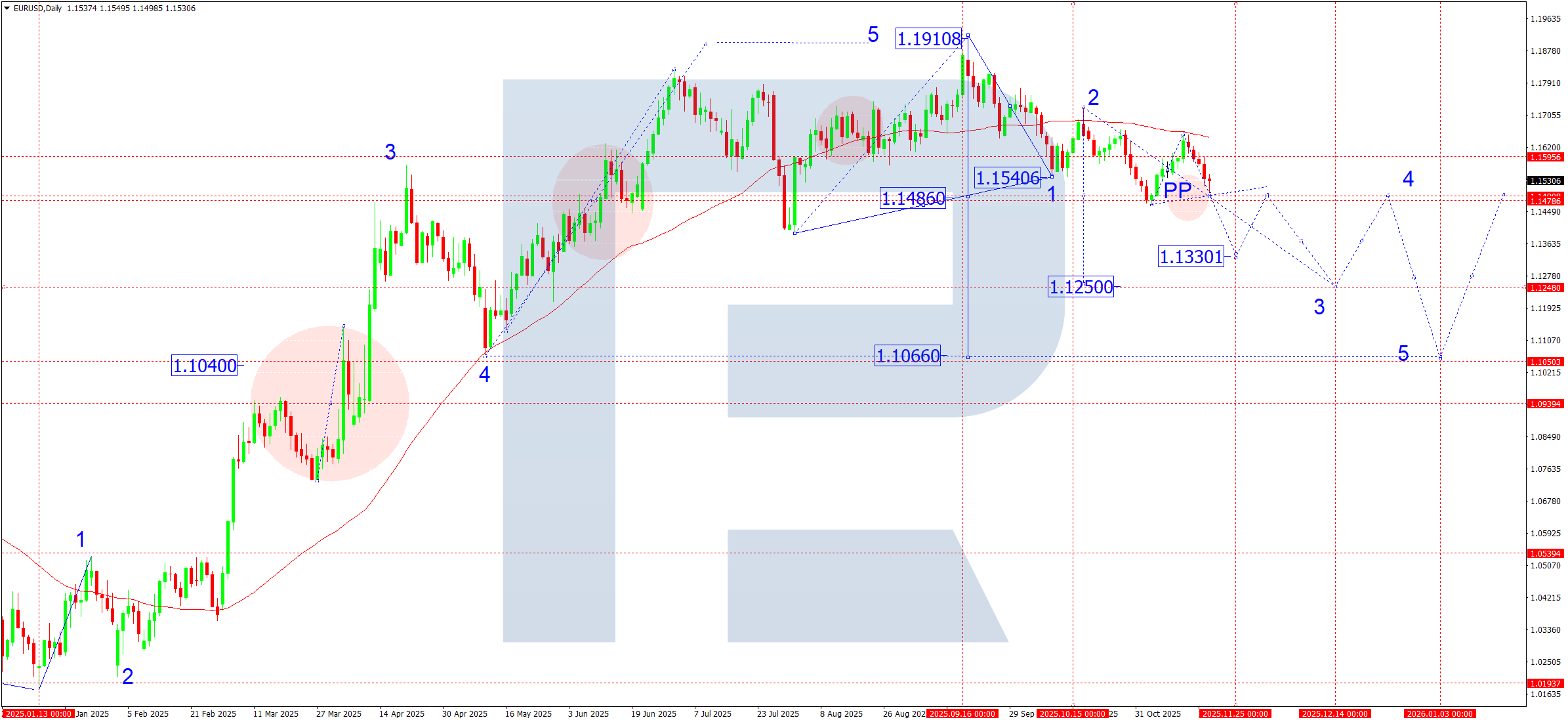Күндік графикте EURUSD жұбы 1.1655-ке дейінгі түзету құрылымын аяқтап, үшінші төмендеу толқынын қалыптастыруда. Қазір алғашқы төмен қозғалыс аяқталды, баға 1.1499-ға дейін сырғып, бұл деңгей ықтимал pivot (бұрылыс) ретінде әрекет етуде. Алдағы аптада 1.1499 үстінде жергілікті консолидация диапазоны қалыптасуы күтіледі. Егер диапазон жоғары бұзылса, құрылым 1.1570-ке дейінгі түзету аяғына (төменнен тест) ұзаруы мүмкін. Егер диапазон төмен бұзылса, үшінші толқын ішіндегі төмендеу жалғасып, мақсаттар ашылады:
