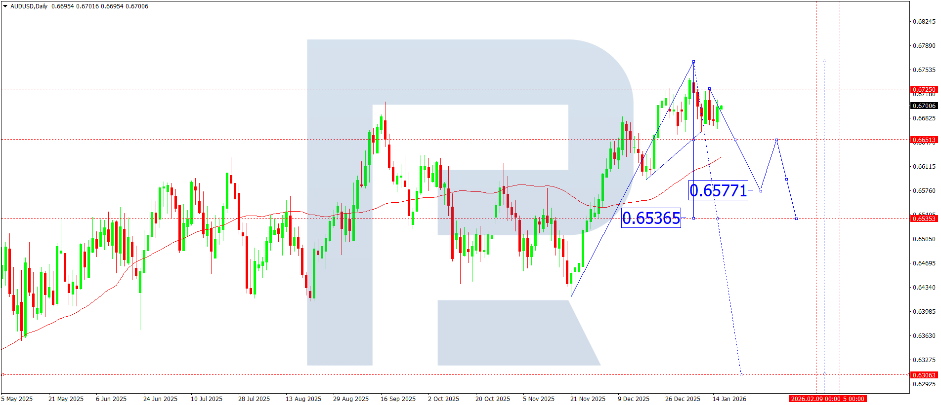 AUDUSD-тың күндік графигінде нарық 0.6700 маңында консолидация диапазонын дамытуды жалғастыруда. 0.6650 бағытына төмендеу күтіледі. Осы деңгейден төмен бұзылу 0.6577 бағытына құлдырауға жол ашады, ал тренд 0.6533-ке дейін ұзаруы мүмкін — бұл алғашқы мақсат ретінде қарастырылады.