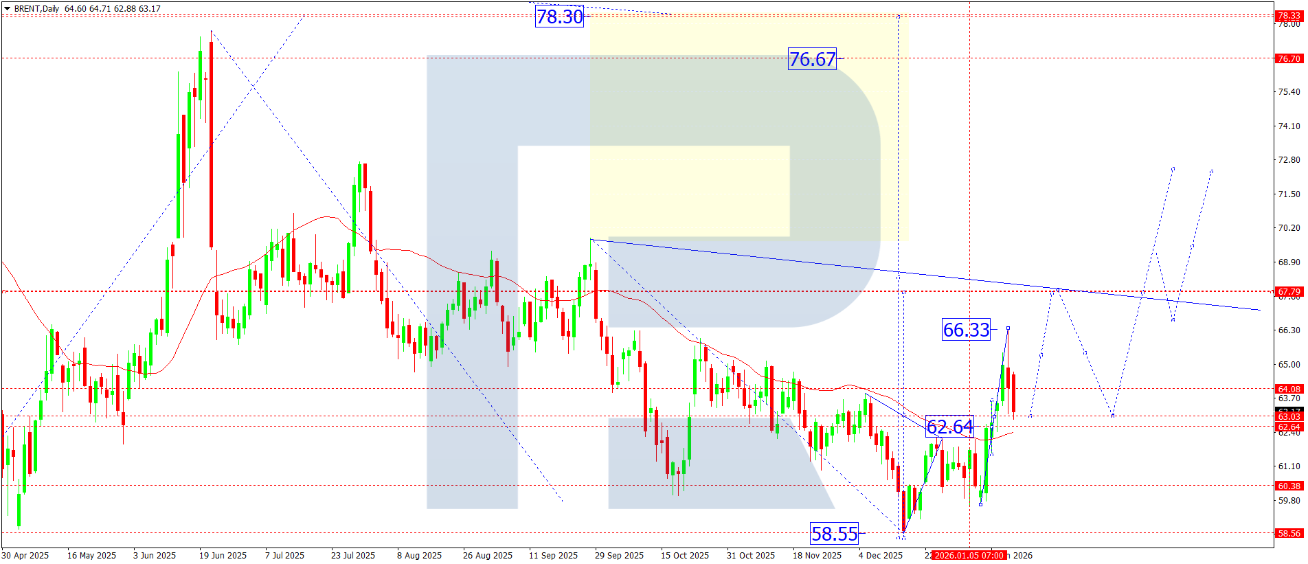 Күндік графикте Brent 66.33 деңгейіне жетіп (жергілікті мақсат), өсу толқыны құрылымын аяқтады. Қазіргі кезде нарық 63.00 бағытына түзетуді аяқтап, осы жерде база қалыптастыруда.
