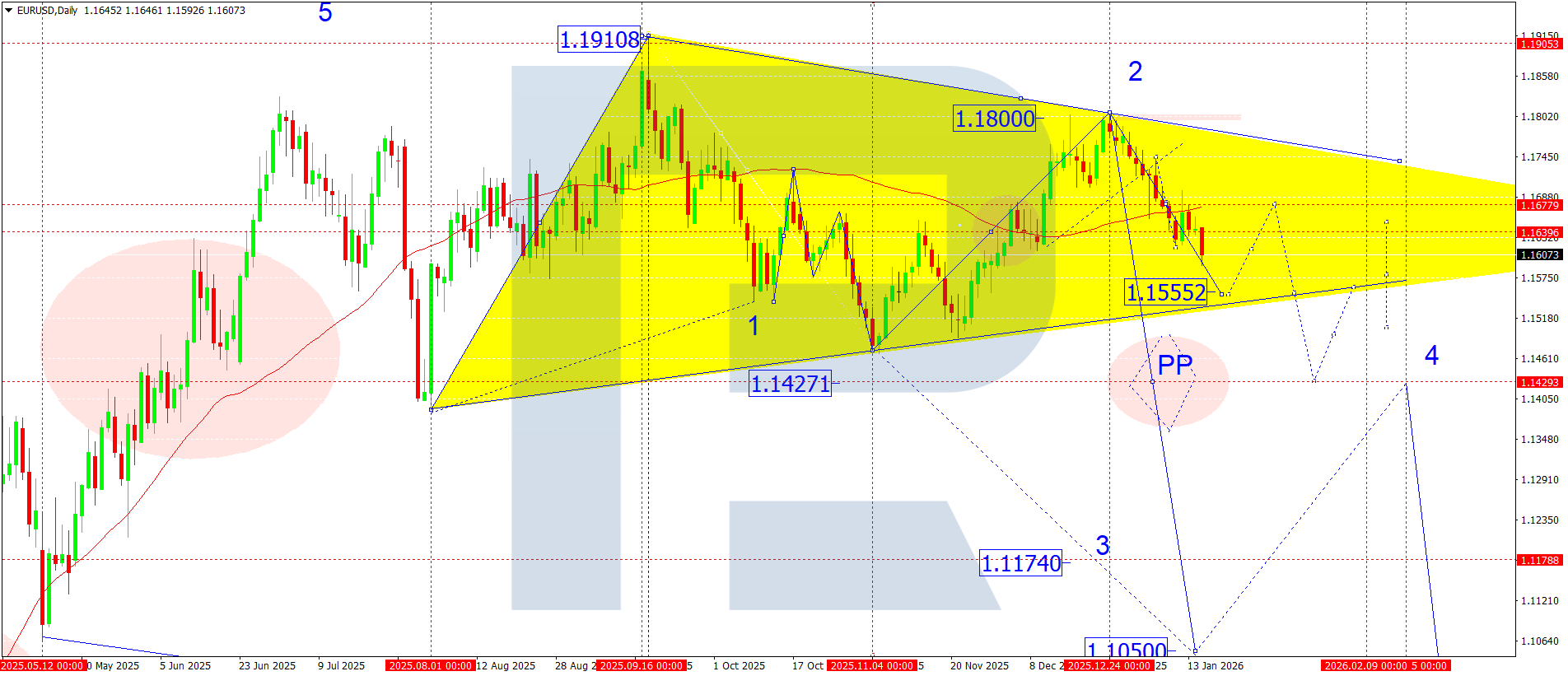 EURUSD-тың күндік графигінде нарық 1.1680 маңындағы SMA 50 деңгейінен төмен бұзылып, орта мерзімді түзетуші құрылым ішінде төмен толқынды қалыптастыруды жалғастыруда. Қазіргі сәтте нарық 1.1555 бағытына қарай қозғалу әлеуетін сақтайды — бұл ағымдағы толқынның ең жақын мақсаты ретінде әрекет етеді.