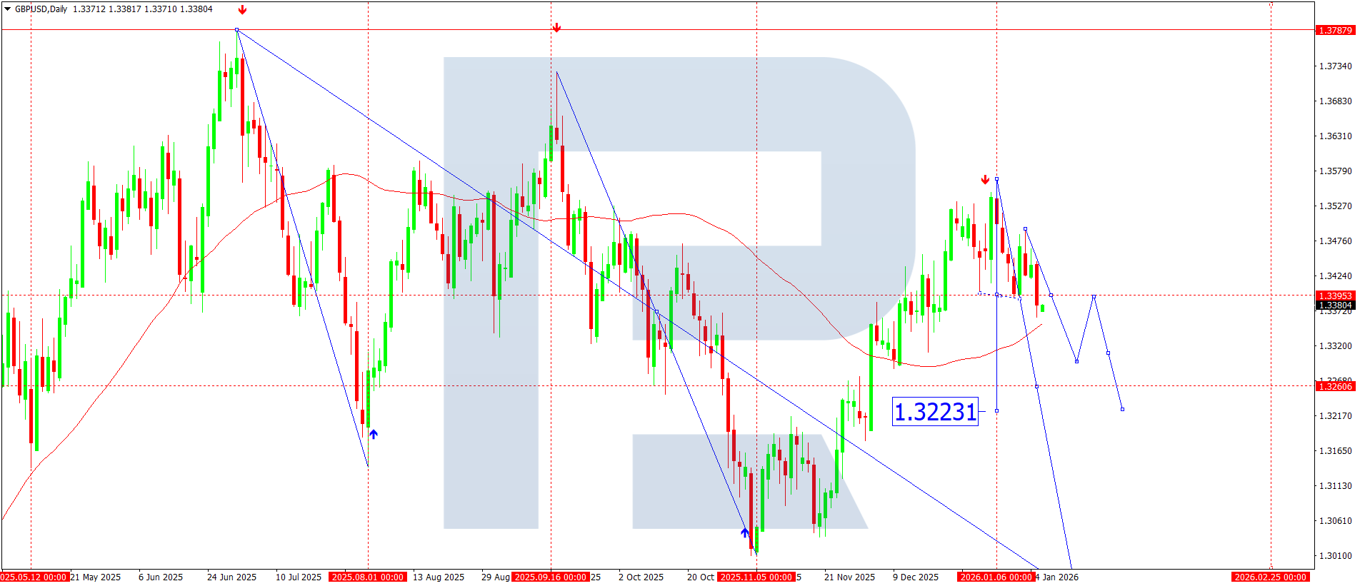 Күндік графикте GBPUSD бірінші төмен импульстің минимумынан төмен бұзылып, төмендеу трендіндегі екінші импульстің дамуын растады. Ағымдағы құрылым ішінде нарық 1.3293 бағытына қарай жылжып келеді — осы деңгейде жергілікті төмендеу фазасының аяқталуы күтіледі.