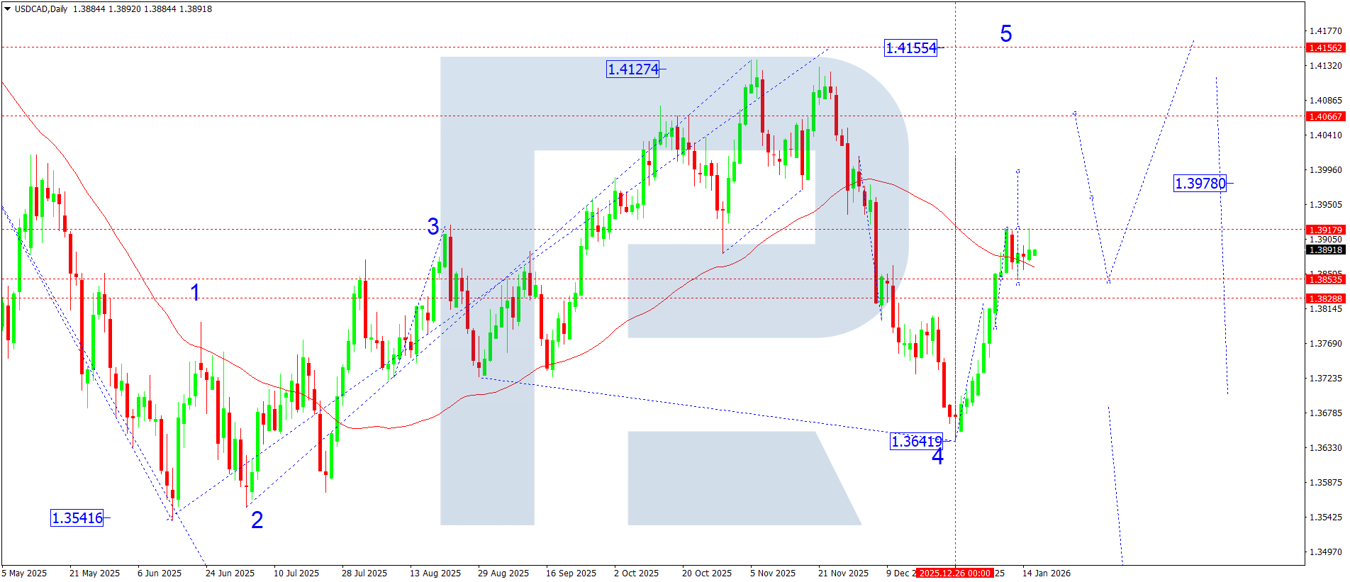 USDCAD-тың күндік графигінде нарық 1.4150 маңындағы мақсатымен импульстік өсім құрылымын қалыптастыруды жалғастыруда.