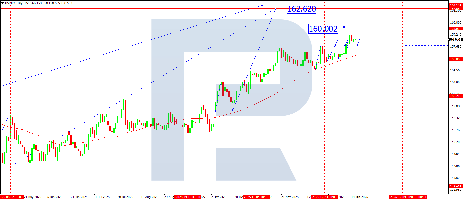 Алдағы аптада бесінші өсім толқынының ұзаруы күтіледі, негізгі мақсат — 160.00. Егер импульс дамыса, толқын 162.62 бағытына дейін әрі қарай кеңеюі мүмкін.