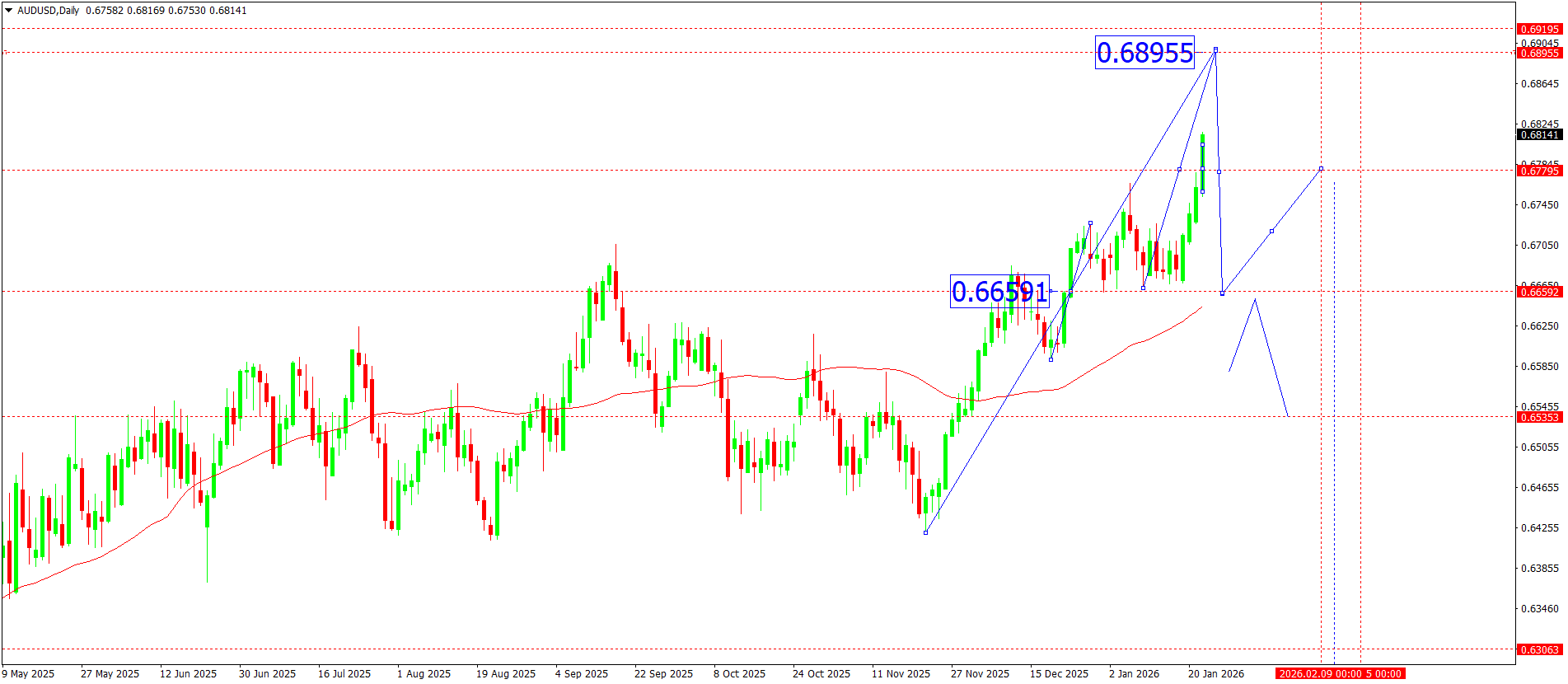 AUDUSD-тың күндік графигінде нарық жоғары толқын құрылымын дамытуды жалғастыруда, ағымдағы мақсат 0.6895 аймағында. Қозғалыс финалдық импульс болып табылады, бұл осы қарсылық деңгейі маңында жергілікті төбенің қалыптасу ықтималдығын арттырады.