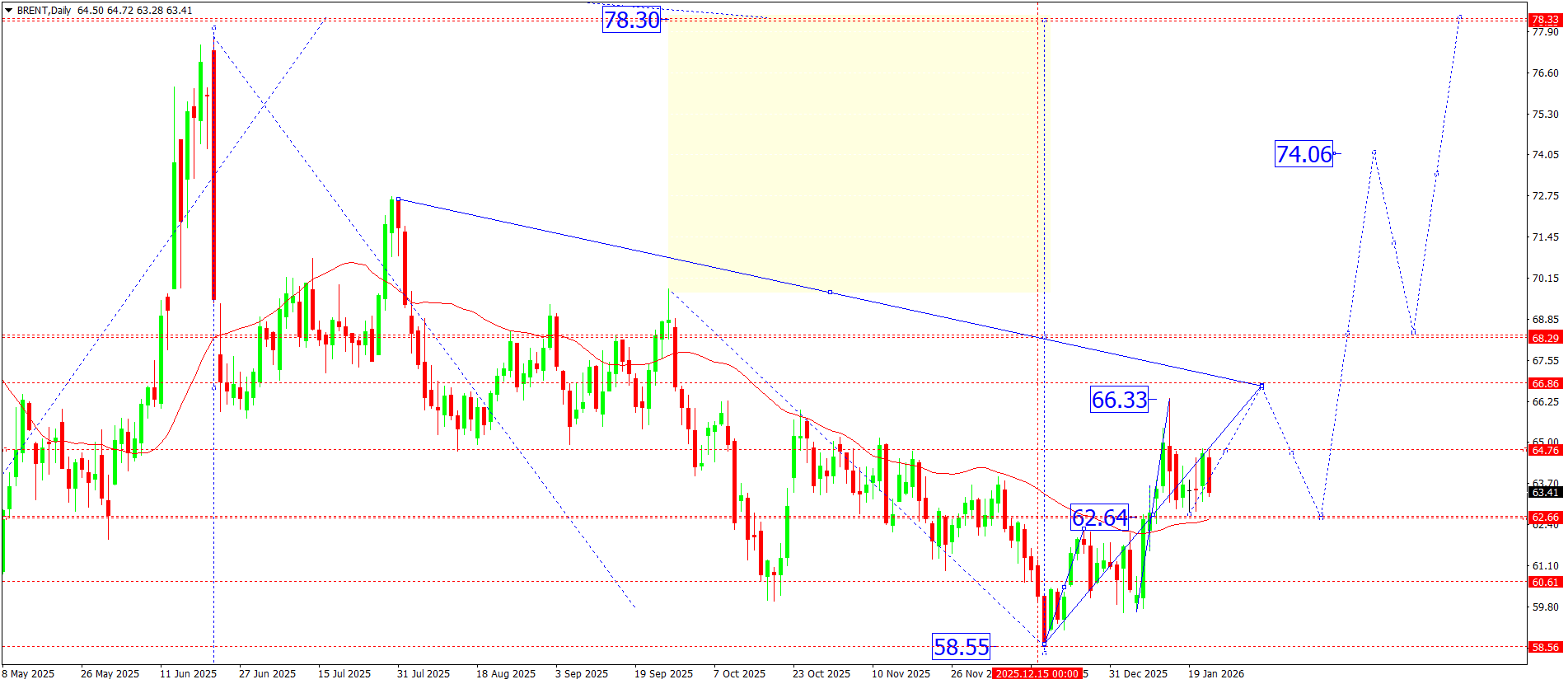 Күндік графикте Brent мұнайы өсім толқынының құрылымын қалыптастыруда, жергілікті мақсат шамамен 66.75 деңгейінде. Импульс аяқталғаннан кейін нарық төмен қарай түзетіліп, 63.00 деңгейіне дейін түсті, осы жерде сатып алу қызығушылығы пайда болды.