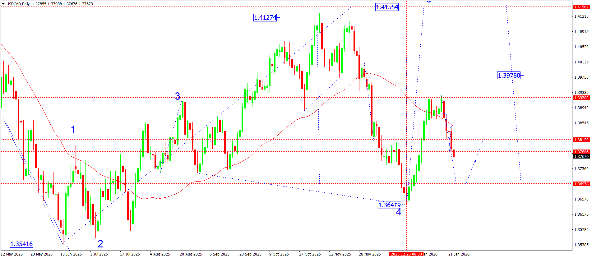 USDCAD-тың күндік графигінде нарық 1.3780 деңгейінен төмен сенімді бұзылып, түзетуші құрылымның аяқталғанын және жаңа төмен толқынға өткенін растады. Ағымдағы импульс фазасы негізгі мақсат деңгейі 1.3698-ге жетуге бағытталған, мұнда ішінара пайда фиксациясы және төмен қозғалыстың баяулауы күтіледі.